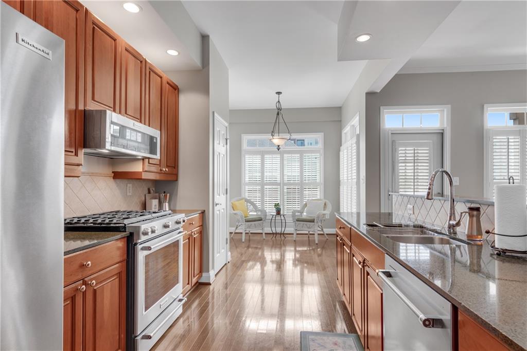 - KitchenBreakfast Bar, Breakfast Room, Cabinets Stain, Eat-in Kitchen, Pantry, Stone Counters, View to Family Room