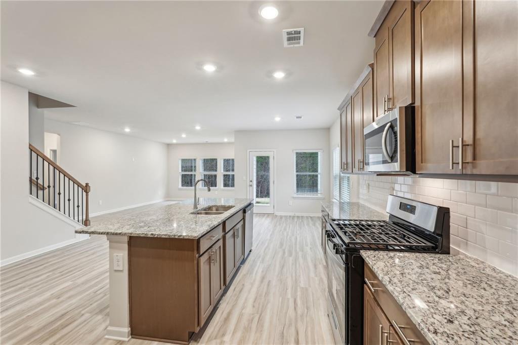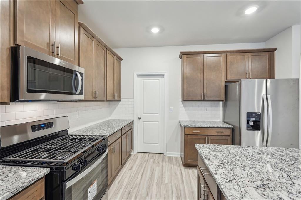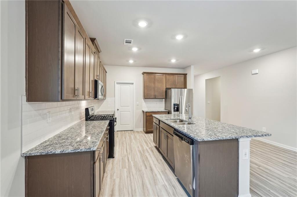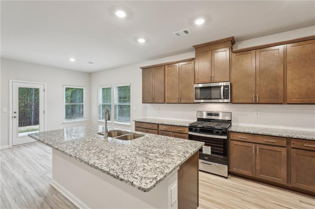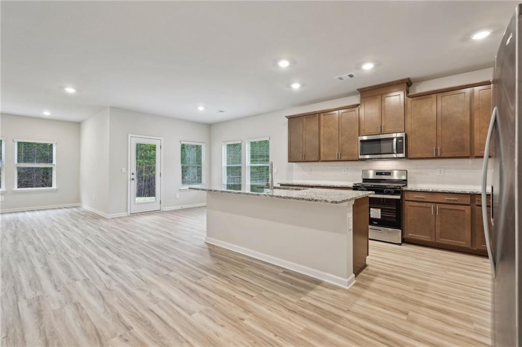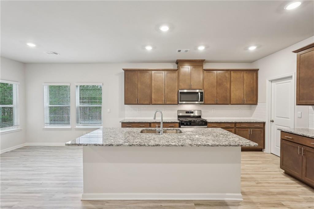 - KitchenEat-in Kitchen, Kitchen Island, Pantry Walk-In, Stone Counters, View to Family Room