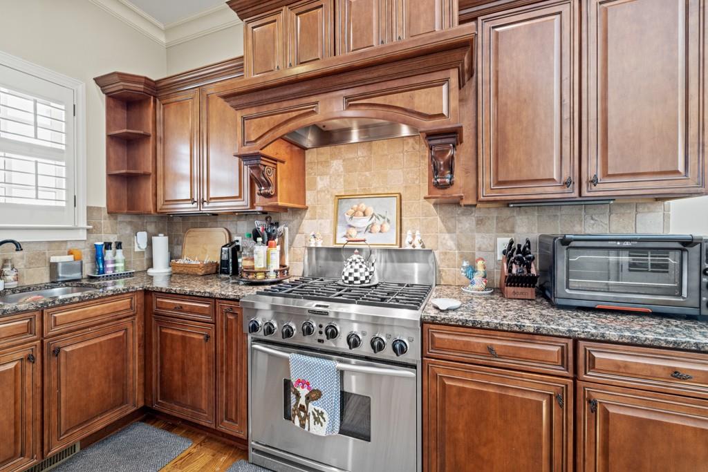 Stunning Executive home located in a small community. All the finest features of a custom built home. 11 ft ceilings, 8 ft solid wood doors, Kitchen-Aid Pro Series appliances. Granite, seamless shower door, rich hardwood flooring throughout main level (except master). New carpet upstairs. Oversized rooms upstairs including one huge room with walk in closet and attached to full bathroom. Real stone & brick front elevation, not synthetic. Exposed aggregate driveway, 2 x 6 construction, silent floor system. Cat-5 wiring, main level completely wired for sound system. Upgraded trim package throughout. Full, clean, unfished basement with interior and exterior access. Trex decking on rear covered porch. Very well maintained. New fence being professionally installed the first week of June.