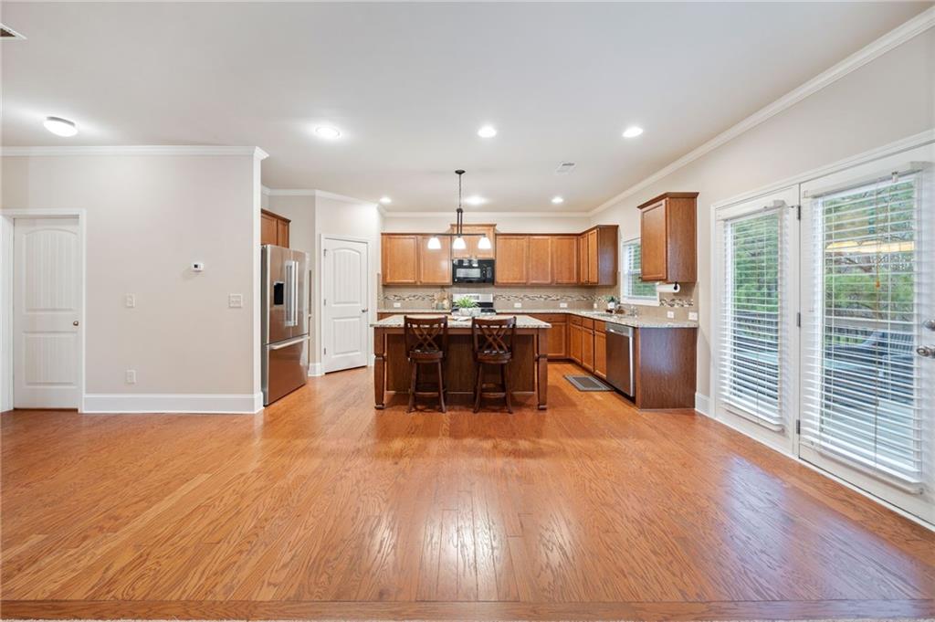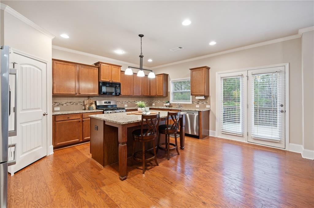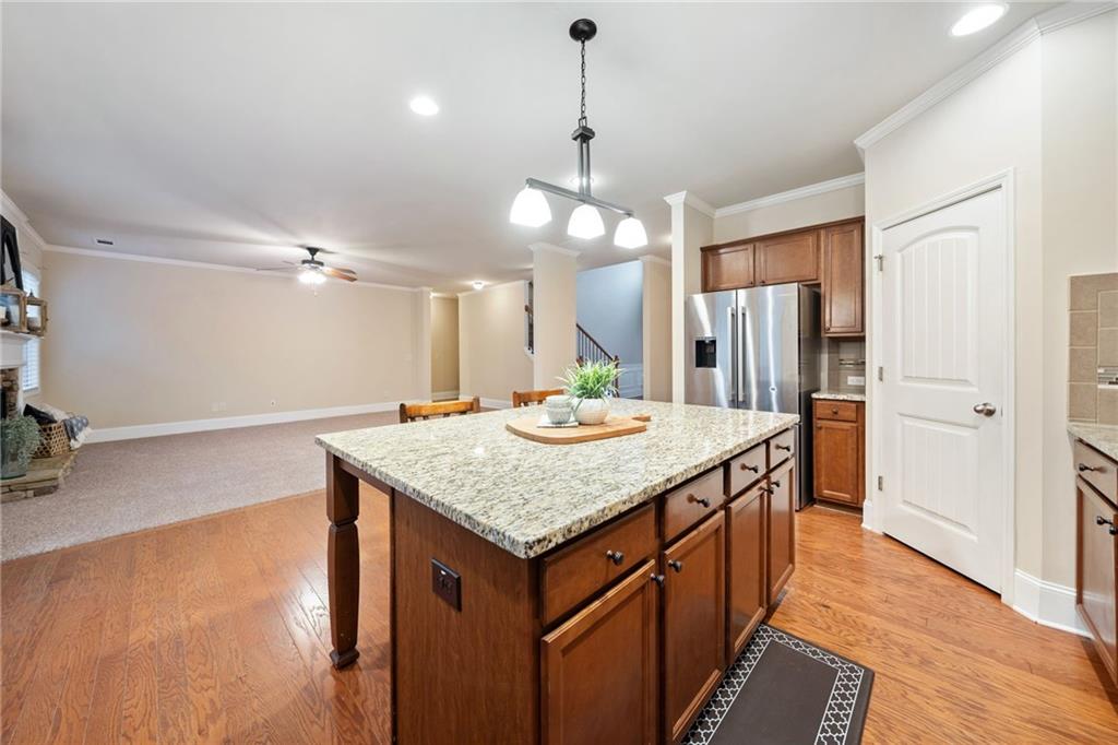 - KitchenBreakfast Bar, Cabinets Stain, Kitchen Island, Pantry, Stone Counters, View to Family Room