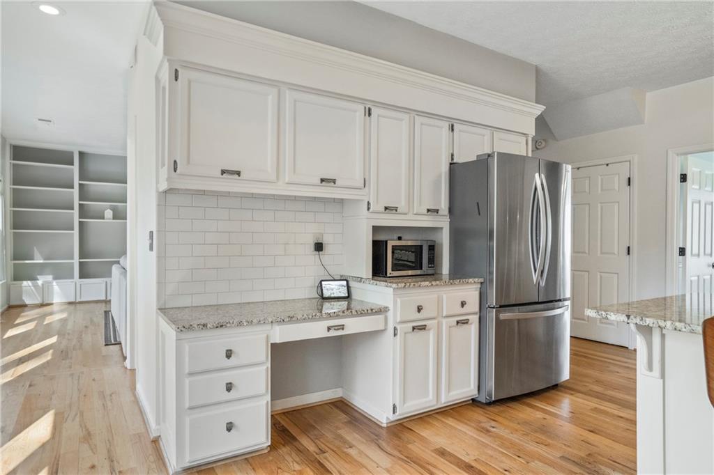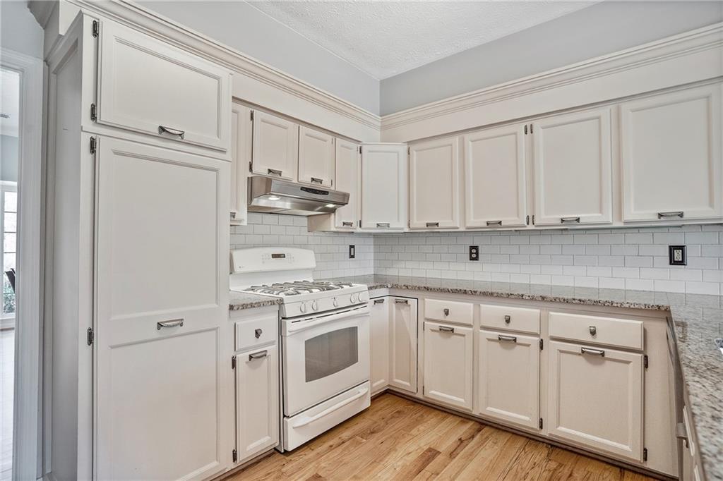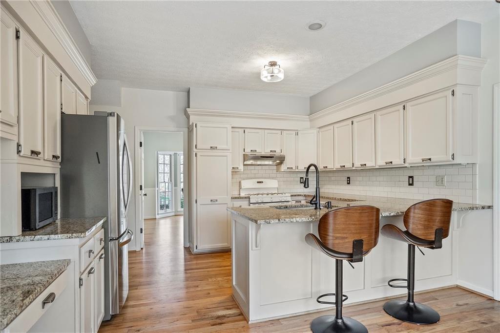 - KitchenBreakfast Bar, Cabinets White, Eat-in Kitchen, Pantry, Stone Counters, View to Family Room