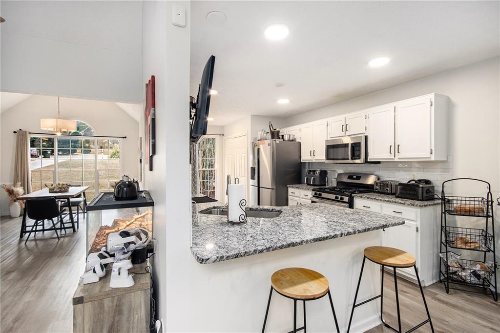 - KitchenBreakfast Bar, Breakfast Room, Cabinets White, Pantry, Stone Counters