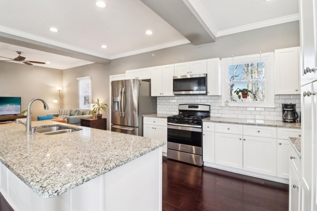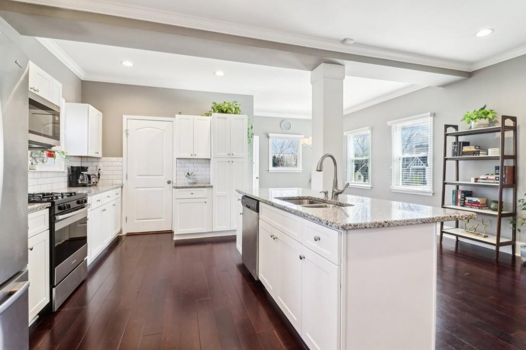 - KitchenCabinets White, Eat-in Kitchen, Kitchen Island, Pantry, Stone Counters, View to Family Room