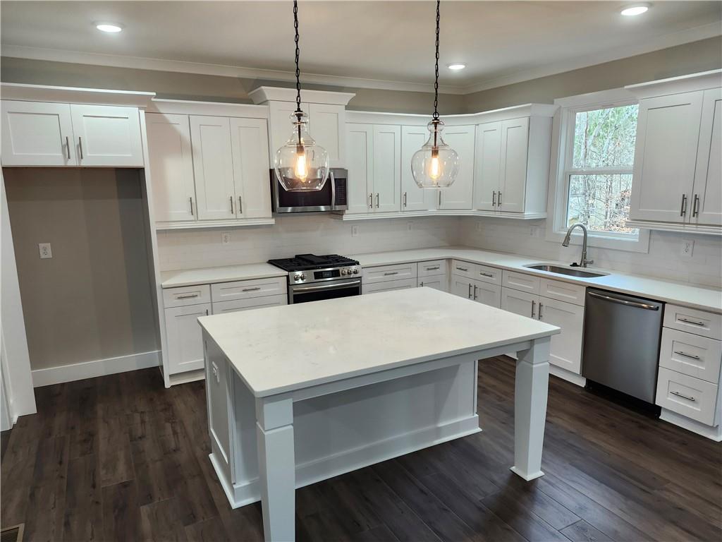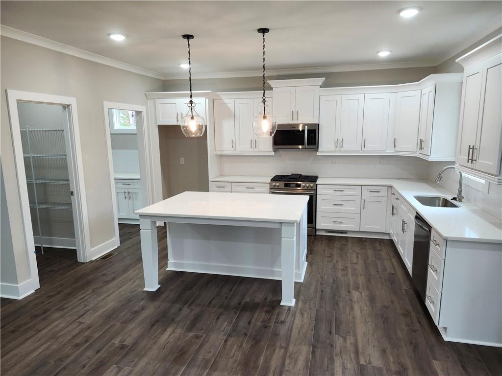 - KitchenCabinets White, Eat-in Kitchen, Kitchen Island, Pantry Walk-In, Solid Surface Counters, View to Family Room