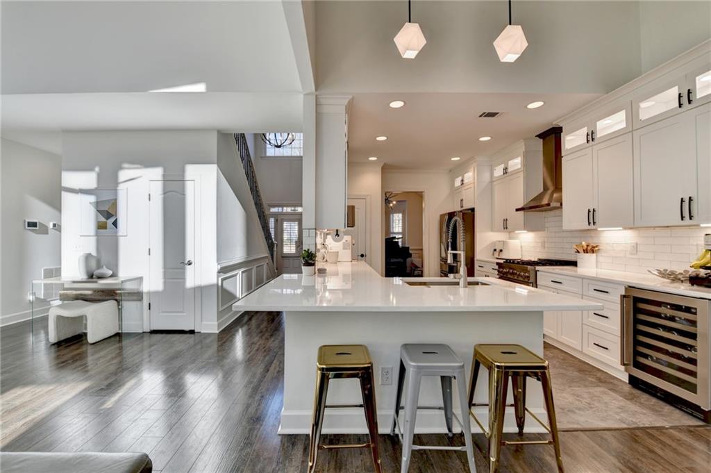- KitchenBreakfast Bar, Cabinets White, Eat-in Kitchen, Pantry, Stone Counters, View to Family Room