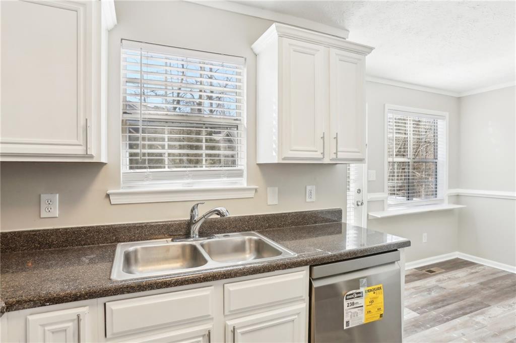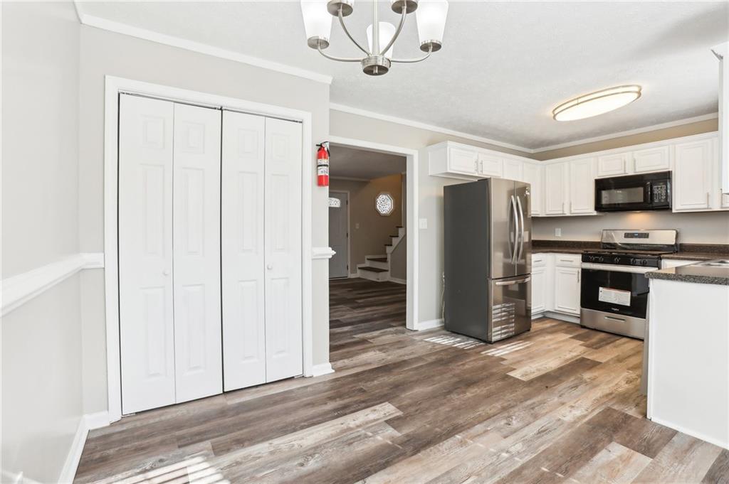 - KitchenCabinets White, Eat-in Kitchen, Stone Counters, View to Family Room