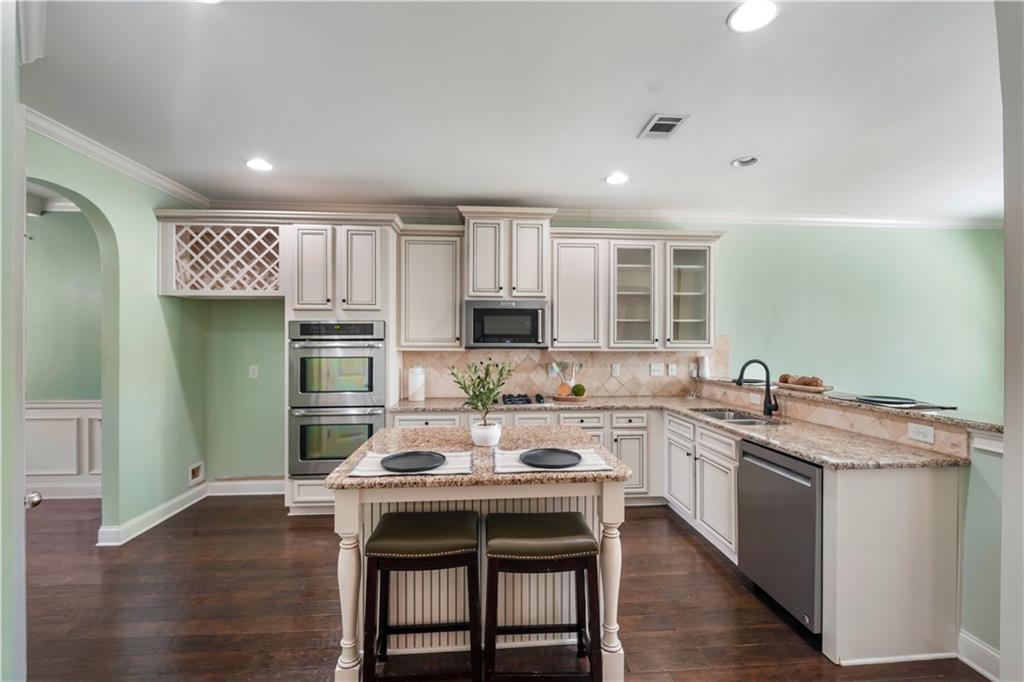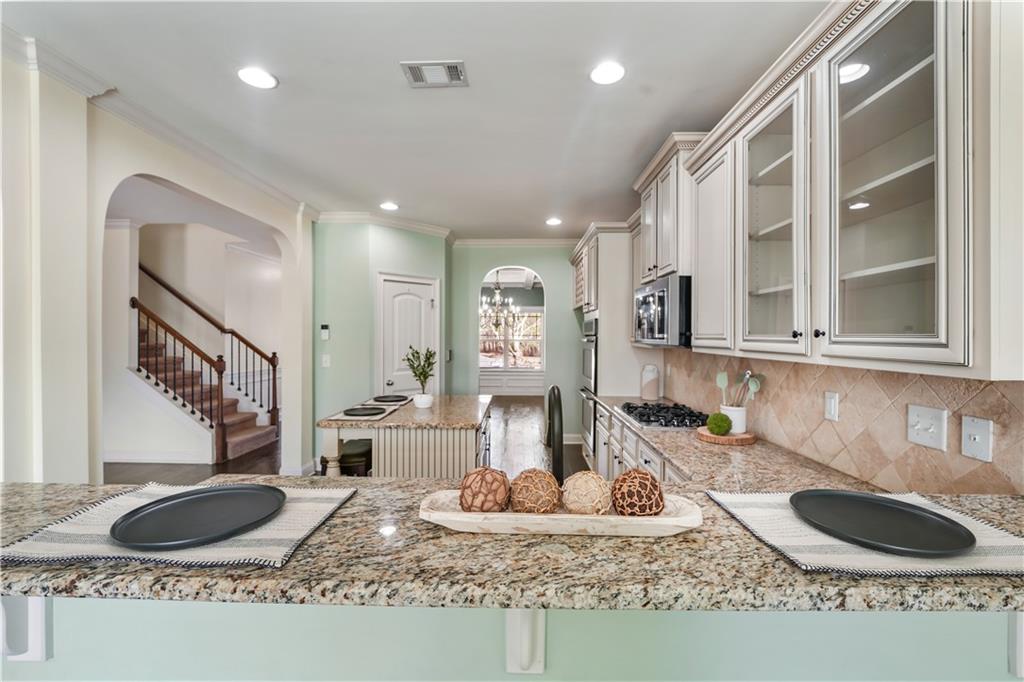 - KitchenBreakfast Bar, Breakfast Room, Cabinets White, Kitchen Island, Pantry Walk-In, Stone Counters, View to Family Room, Wine Rack