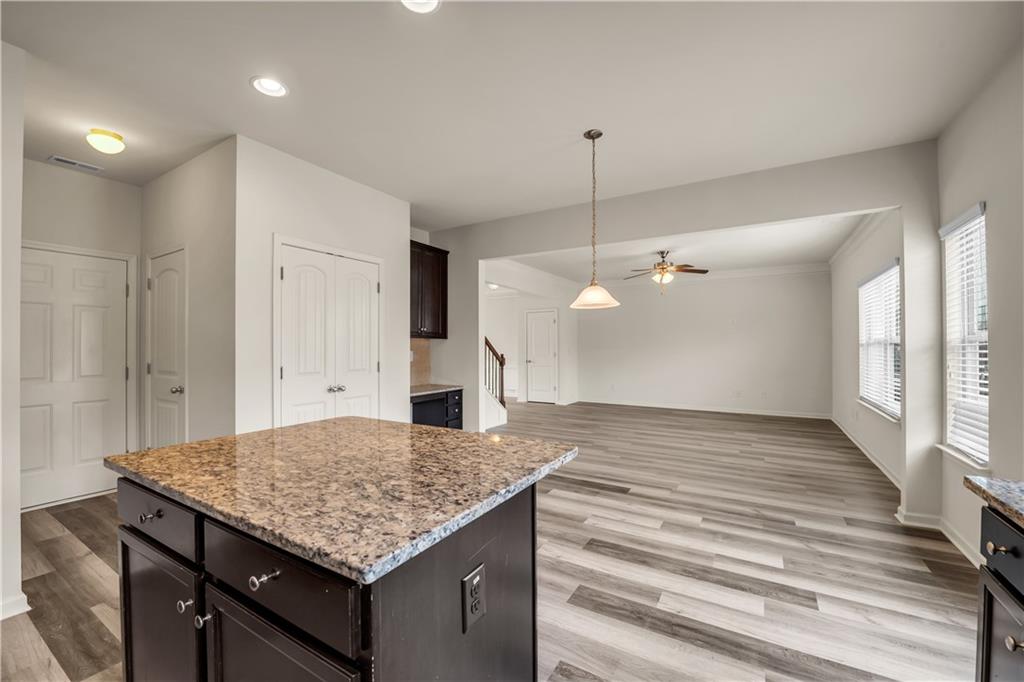 - KitchenCabinets Stain, Cabinets White, Kitchen Island, Pantry, Stone Counters, View to Family Room