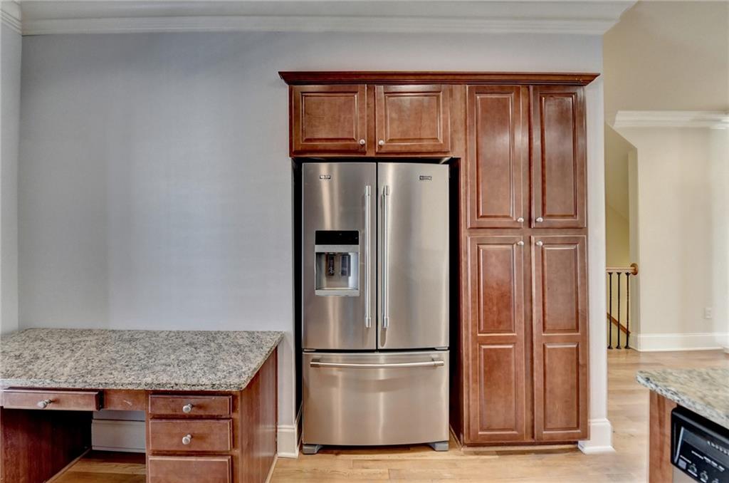 - KitchenBreakfast Bar, Breakfast Room, Cabinets Stain, Pantry, Stone Counters, View to Family Room