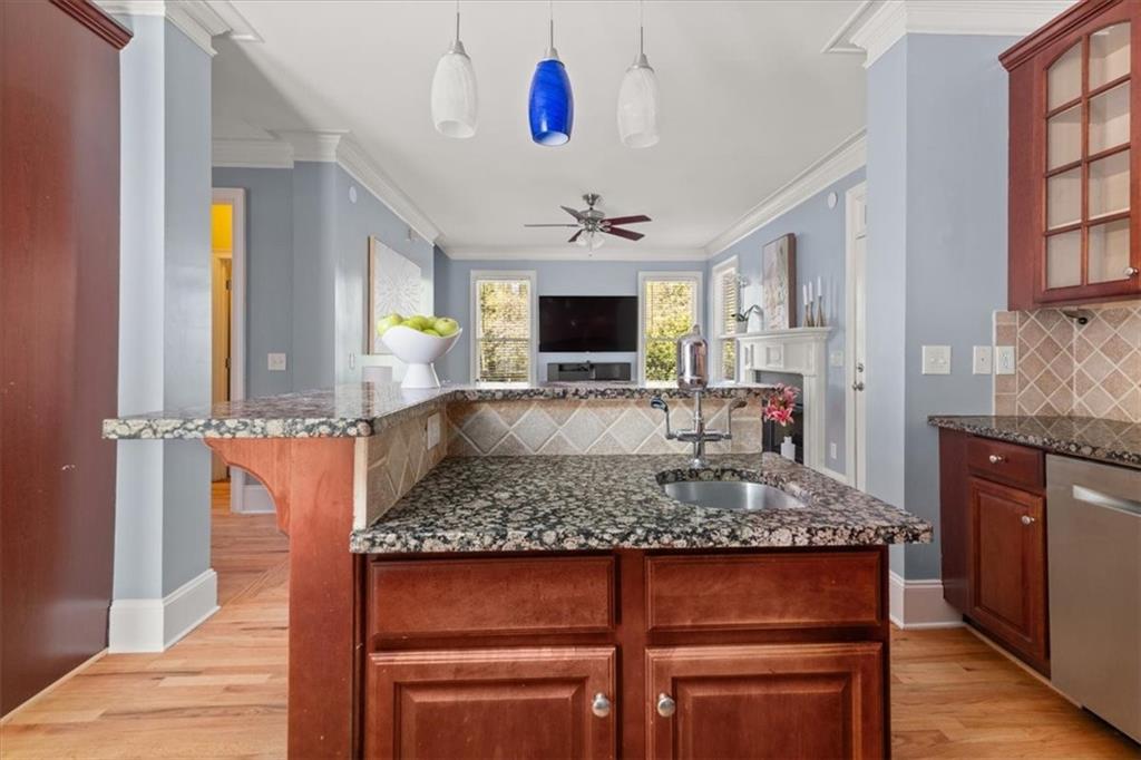 - KitchenBreakfast Bar, Cabinets Stain, Kitchen Island, Stone Counters, View to Family Room