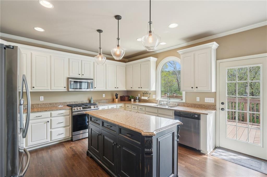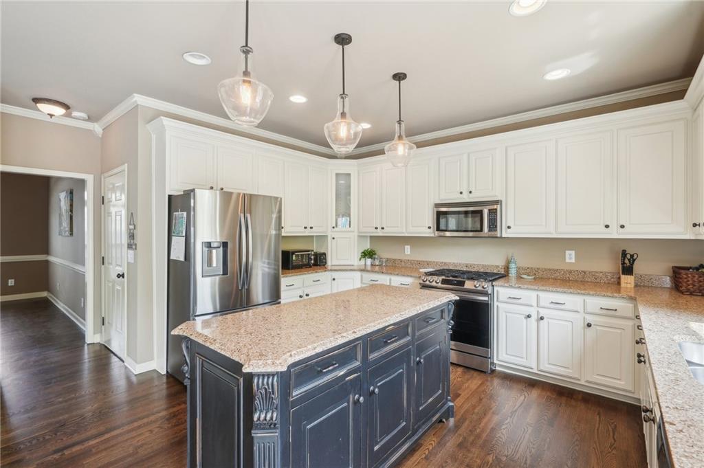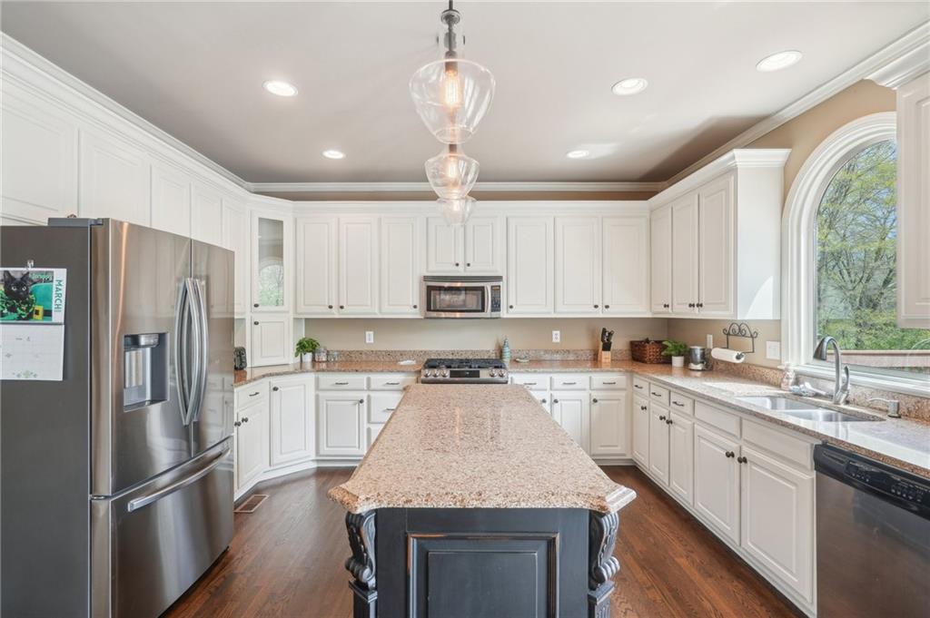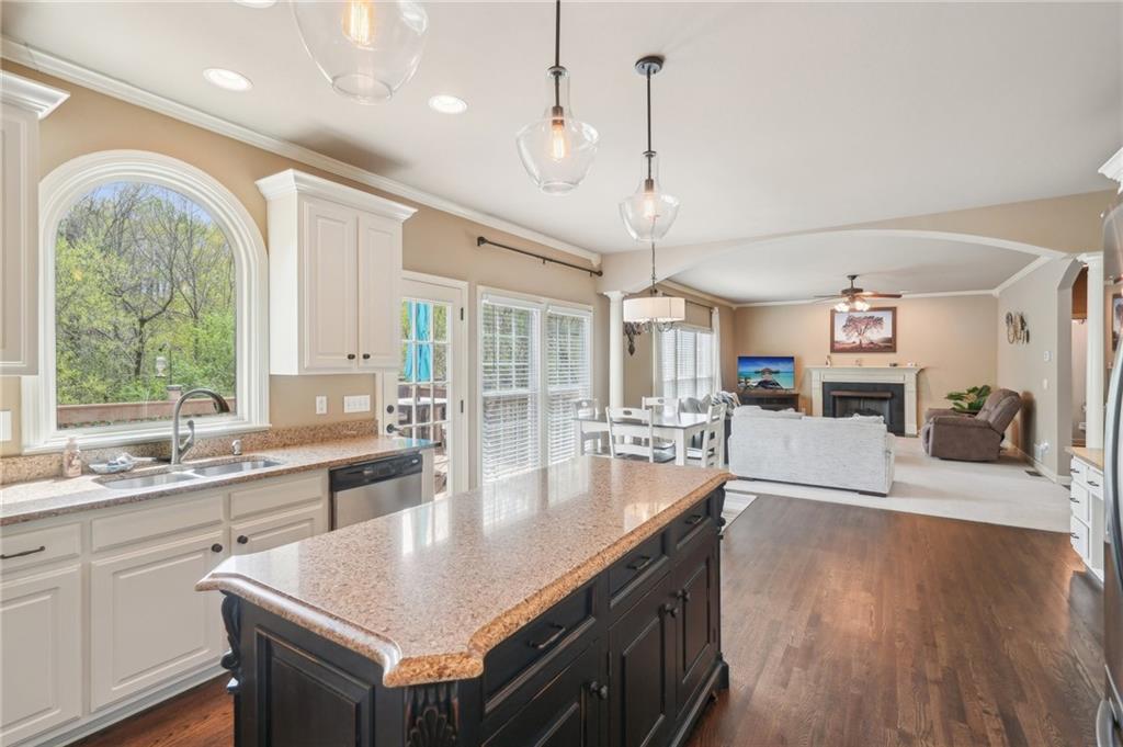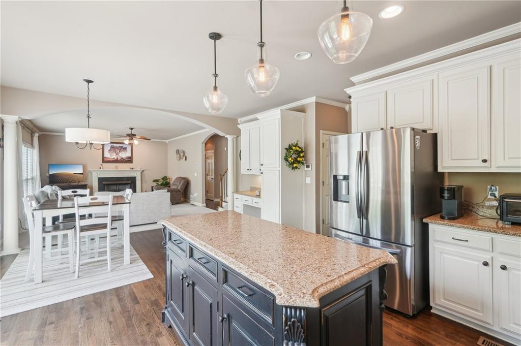 - KitchenCabinets White, Kitchen Island, Stone Counters, View to Family Room