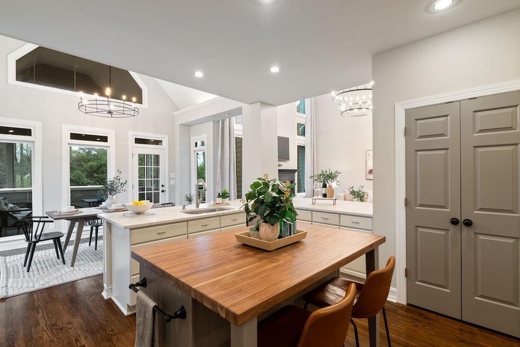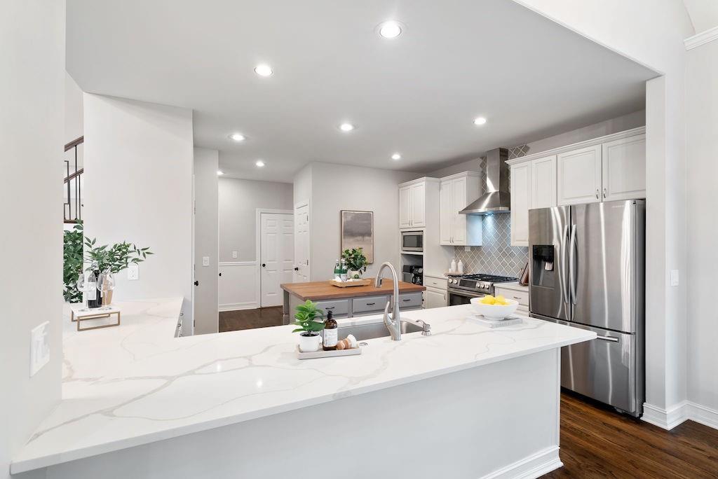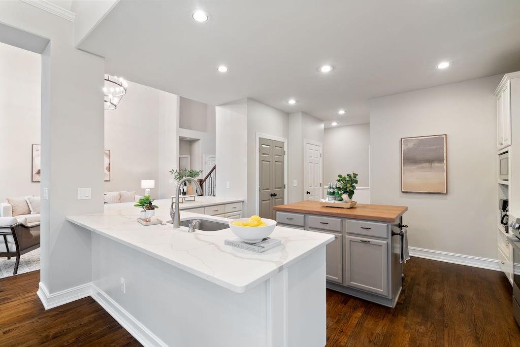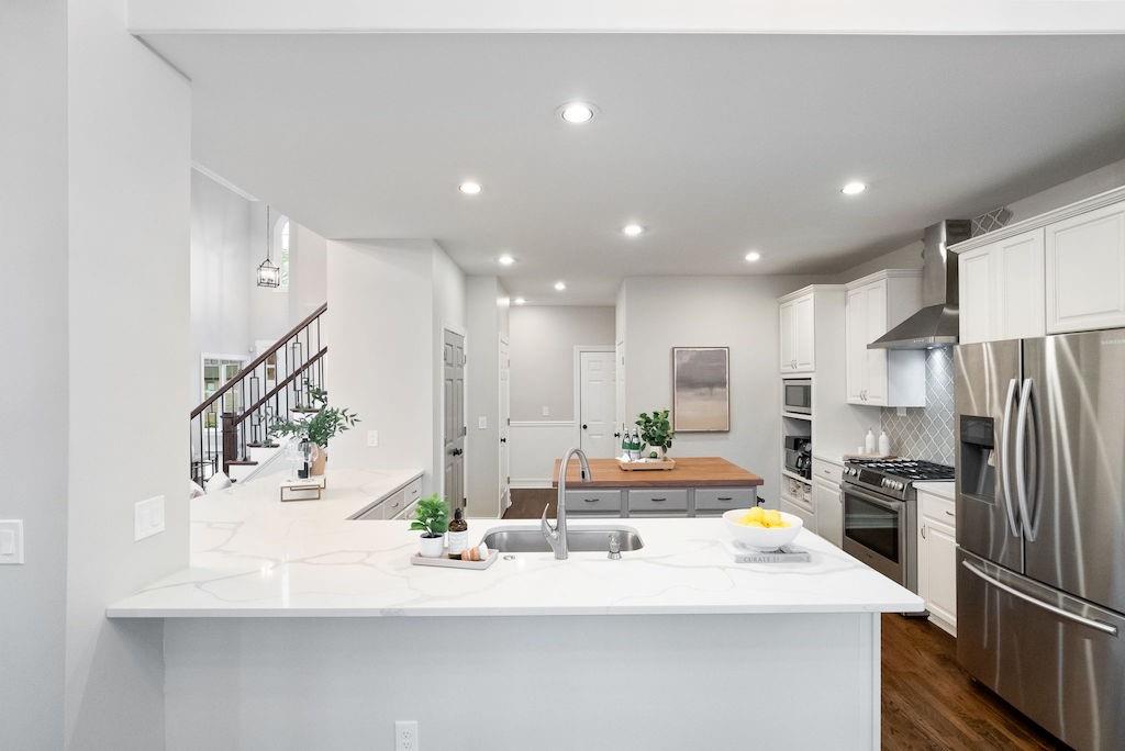 - KitchenBreakfast Bar, Cabinets White, Eat-in Kitchen, Kitchen Island, Pantry, Stone Counters, View to Family Room