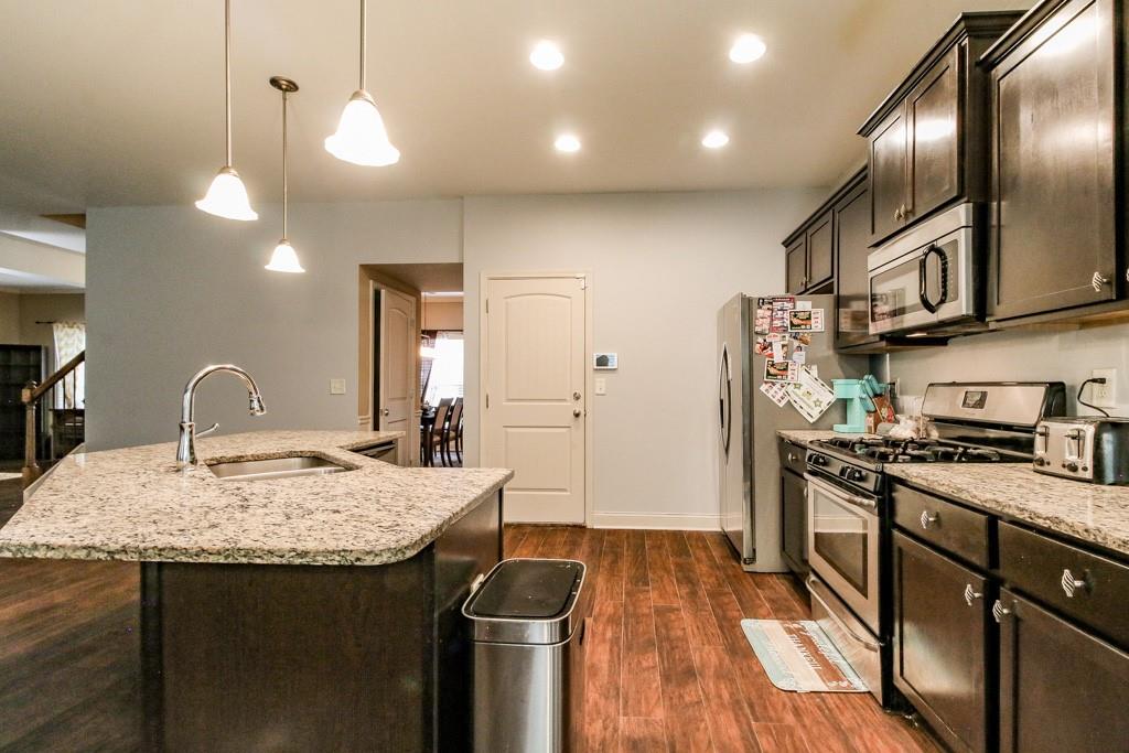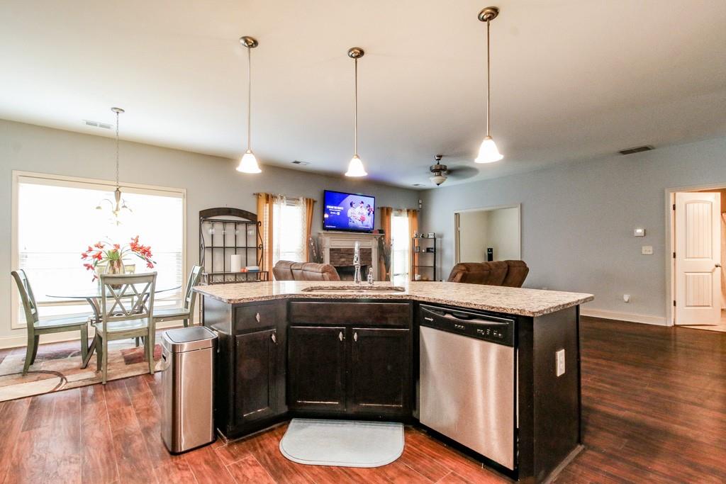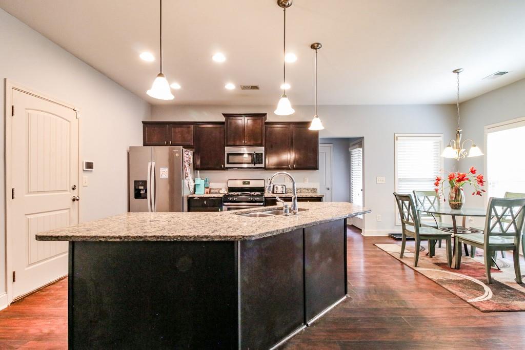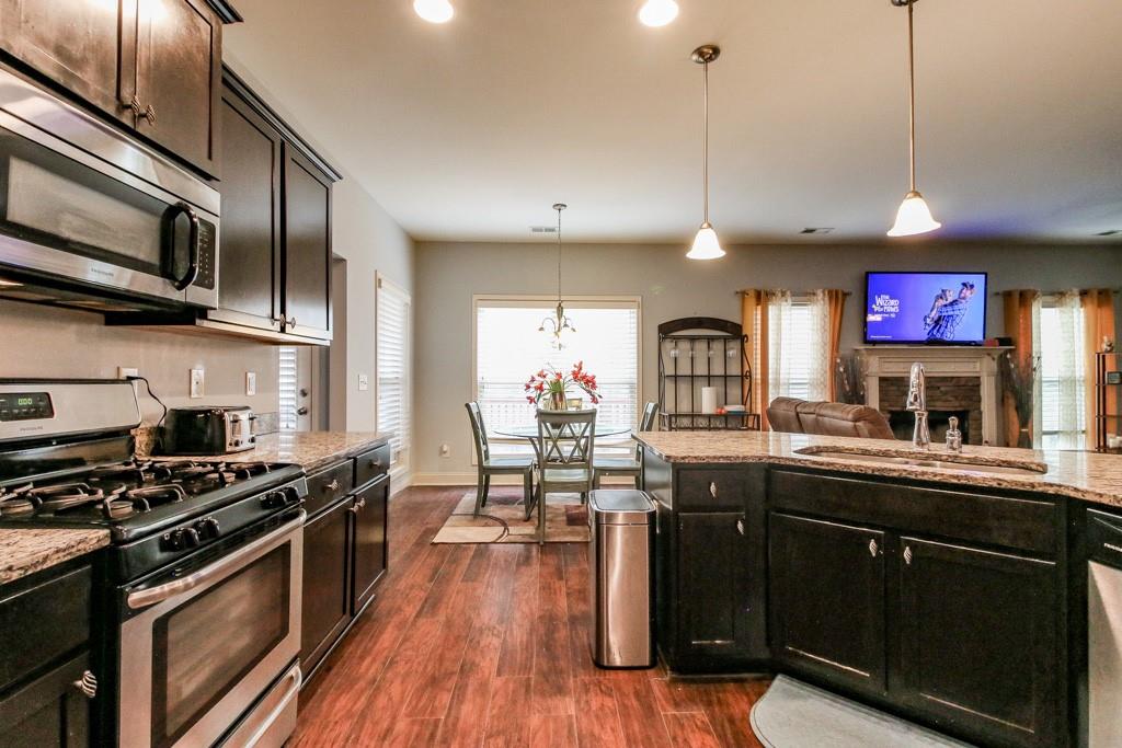 - KitchenCabinets Stain, Eat-in Kitchen, Kitchen Island, Pantry, Stone Counters, View to Family Room