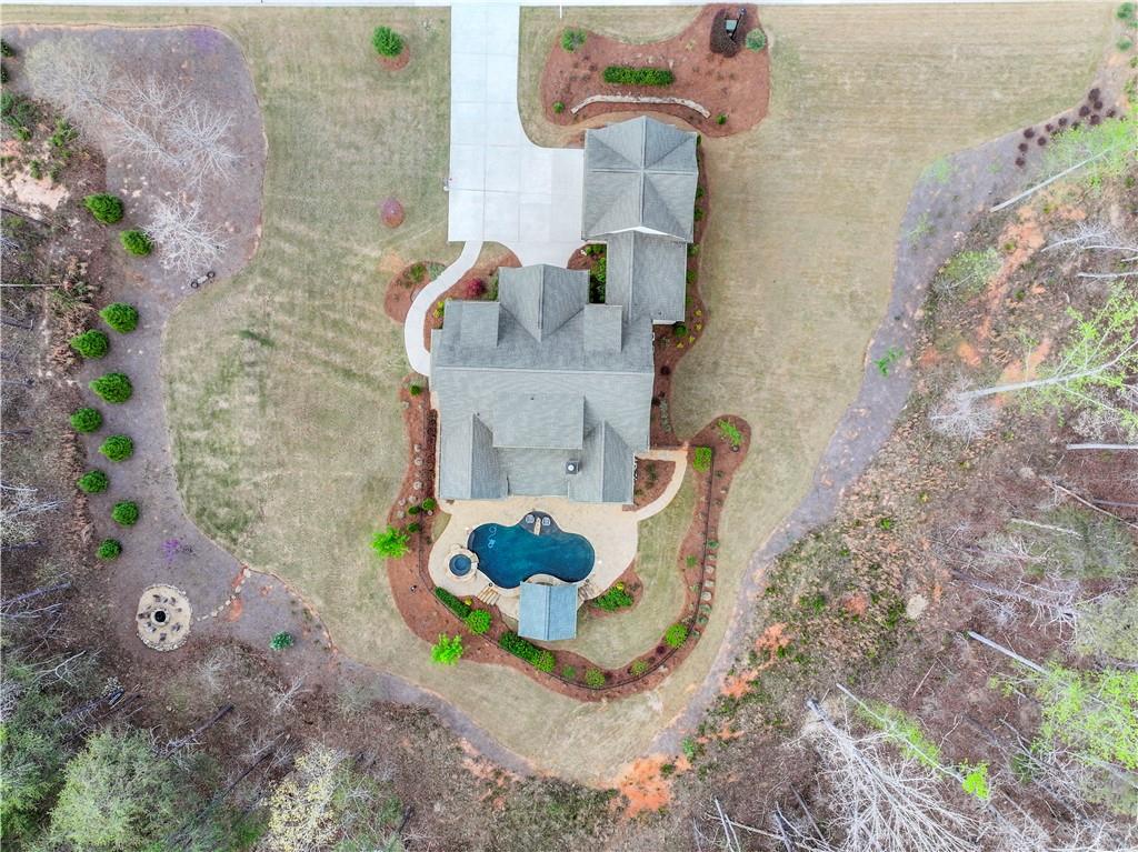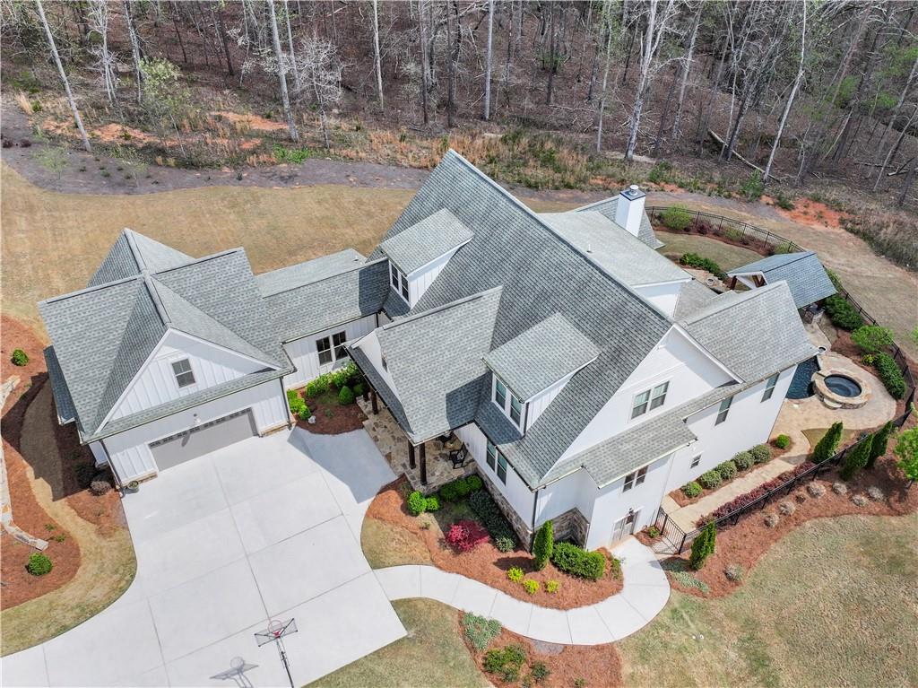 Lake Lanier Dream Home situated on 6 ACRES WITH DEEDED DOCK SLIP AND LIFT- -Welcome to 6061 Bluewater Boulevard, located within the gated community of Dockside Cove this exquisite custom-built home—originally designed as the builder's personal residence—offers luxurious living space across three meticulously finished levels. No detail has been overlooked in this one-of-a-kind retreat. Step into your private outdoor oasis, complete with a resort-style pool, jacuzzi, firepit, and a covered outdoor kitchen—all surrounded by tranquil, wooded scenery for the ultimate in relaxation and entertaining. Inside, the main level showcases a spacious Primary Suite featuring an elegant ensuite bath with double vanities, a separate soaking tub and walk-in shower, and his-and-hers walk-in closets. The gourmet chef’s kitchen is outfitted with high-end stainless-steel appliances, marble countertops, a large center island, cozy breakfast nook with a window seat, and a walk-in pantry. Adjacent to the kitchen is a home office and half bath, along with a grand living room boasting coffered ceilings and custom built-ins. Step outside to the covered porch, accessible from both the living room and the primary suite. From the garage-level entrance, walk into a spacious mudroom with built ins, a large laundry room, and convenient access to the terrace level. Downstairs, discover a full second living area with a complete kitchen (featuring marble countertops), dining area, large open family room with, fitness room, fourth bedroom, and full bath. Also on this level is a concrete-walled "safe room", currently used as a private poker room. French doors open directly to your outdoor sanctuary, complete with Bull Grill, fridge, outdoor shower, and seamless access to the pool and spa. Above the oversized two-car garage (finished with epoxy flooring), you'll find a private guest suite or in-law/teen apartment with its own kitchen and full bath—ideal for extended family, guests, or even a home office. On the third floor, there are two additional large bedrooms connected by a Jack and Jill bath, plus a generous bonus room and cozy sitting area at the top of the stairs. All of this with an included Dock Slip and Lift. Agents, the home is situated on 2 of the 6 acres with 2 acre lots on each side that can be sold separately. Please note that the HOA has combined