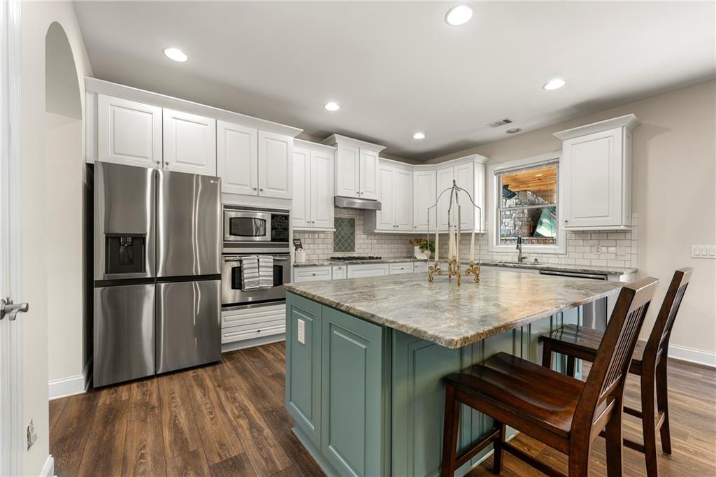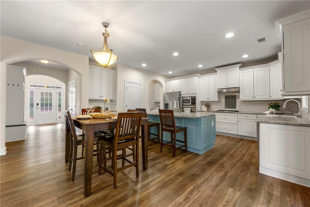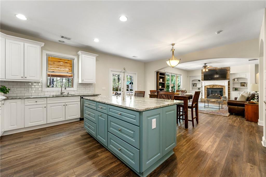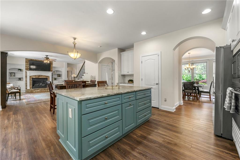 - KitchenCabinets White, Eat-in Kitchen, Kitchen Island, Pantry Walk-In, Stone Counters, View to Family Room