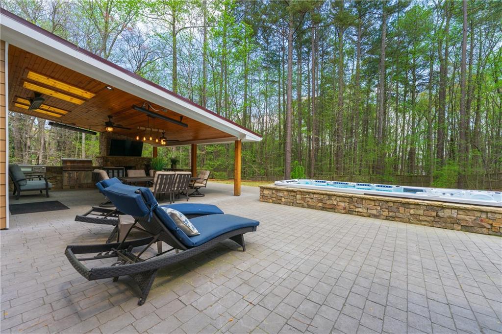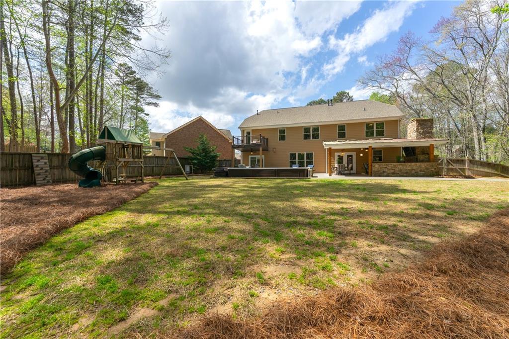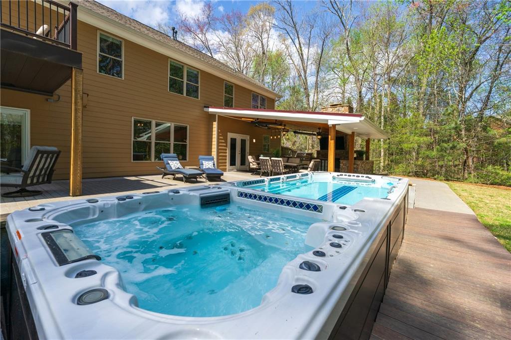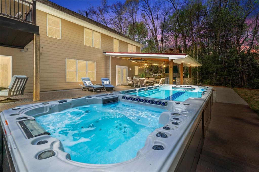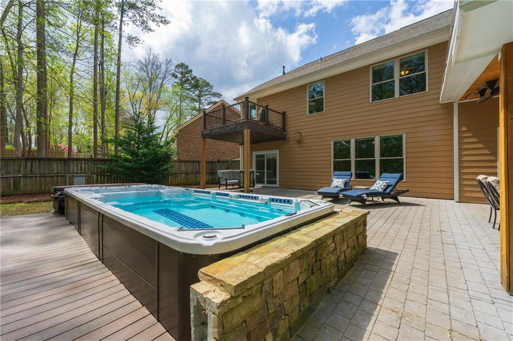 Welcome to Everleigh Estates! This gorgeous traditional home with craftsman touches and backyard oasis is ready for its next owners. Freshly painted and impeccably maintained. Located on a cul de sac, you are greeted by a beautifully landscaped lawn and front porch. As you enter, gleaming dark flooring, dining room and office or playroom. Living room has built in bookshelves and storage. Kitchen features leathered stone countertops, huge island, custom backsplash and stainless appliances. Bedroom and full bathroom on first floor make an excellent space for guests or a private home office. Out the back door you will find a breathtaking backyard space. Complete with covered patio featuring built in grill, mini fridge, and fireplace. Swim spa with hot tub and mounted heaters make this a dream for both summer and winter enjoyment. All overlooking large private backyard. Upstairs are 3 secondary bedrooms, bathroom and loft space. Master bedroom has its own private deck, walk in closet and bathroom with two separate vanities, soaking tub and shower. Fabulously located with easy access to all Marietta has to offer.