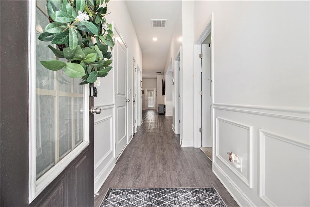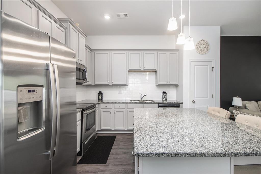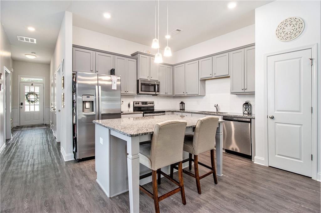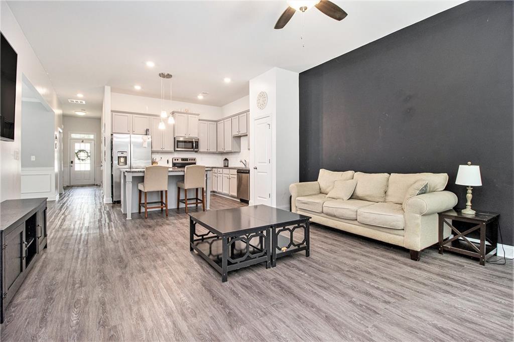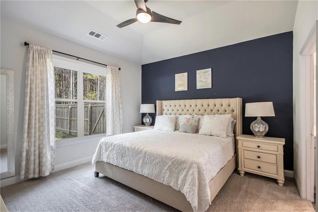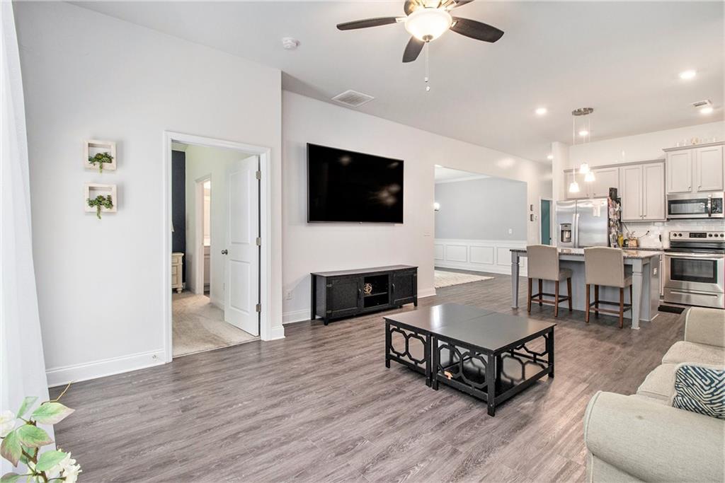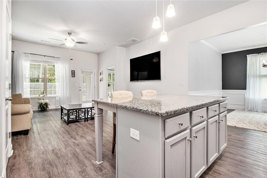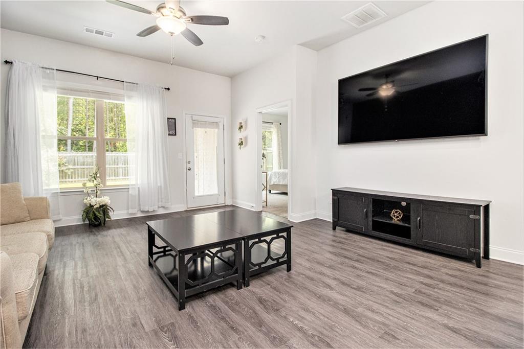 From the moment you step inside, you'll feel right at home in this thoughtfully designed space. The open-concept floor plan seamlessly connects the living, dining, and kitchen areas—ideal for entertaining guests or enjoying everyday comfort. High 9-foot ceilings and durable LVP flooring throughout add a sense of spaciousness and style. The kitchen is a true showstopper, featuring an oversized granite island that's perfect for family meals, casual hangouts, or game nights. With abundant counter space, sleek finishes, and high-end appliances, it's a dream setup for any home chef. This home offers a desirable split-bedroom layout for added privacy. The primary suite is your personal retreat, complete with a double vanity, a luxurious oversized shower, and a huge walk-in closet. Step outside and enjoy quiet mornings on the front porch or unwind in the evenings under your covered back patio. The private, fenced-in yard is perfect for pets, play, or gardening. Located in a charming gated community within walking distance to downtown Villa Rica, you're just minutes from shopping, dining, Plus, you'll have easy access to local parks, the Recreation Center, a splash pad, and Arbor Place Mall—all within a 15-minute drive.