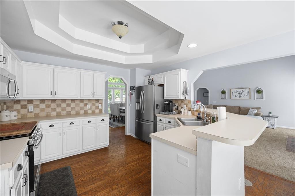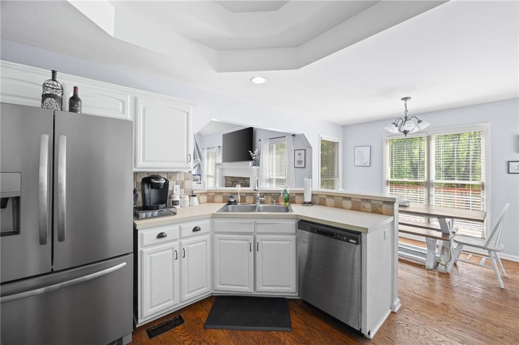 - KitchenBreakfast Bar, Cabinets White, Laminate Counters, Eat-in Kitchen, Pantry, View to Family Room