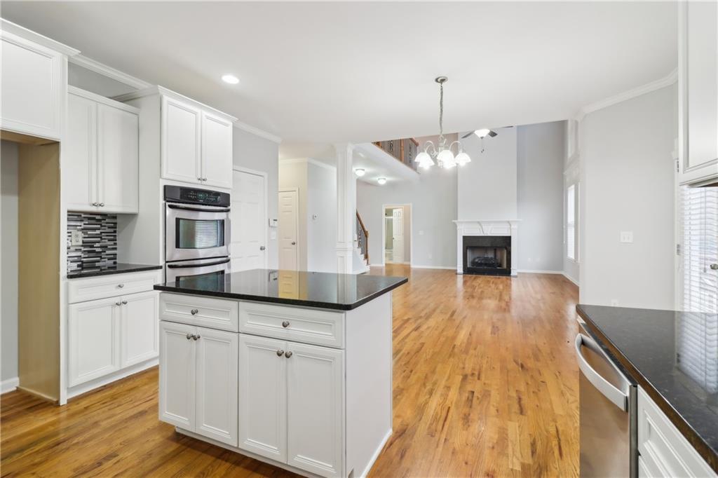 - KitchenBreakfast Room, Cabinets White, Eat-in Kitchen, Kitchen Island, Pantry Walk-In, Solid Surface Counters, View to Family Room