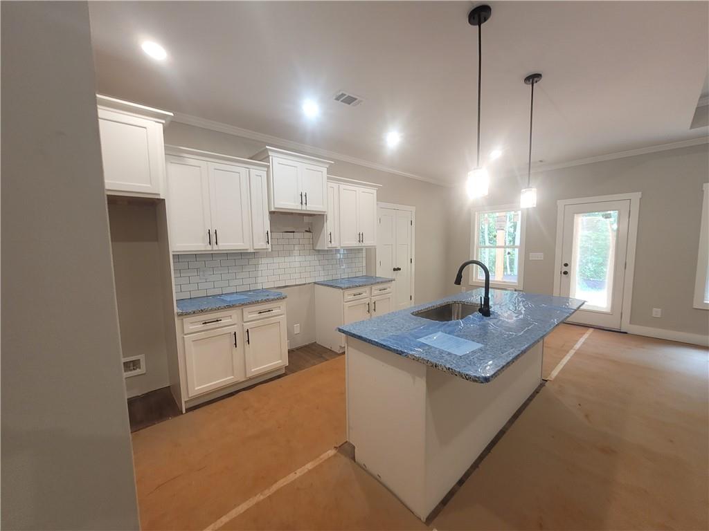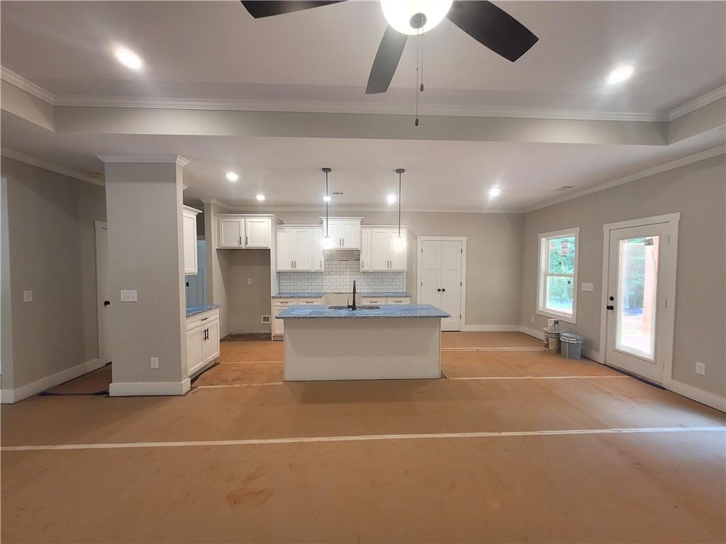 - KitchenCabinets White, Kitchen Island, Pantry, Stone Counters, View to Family Room