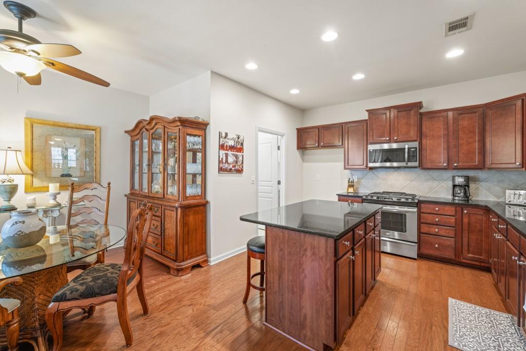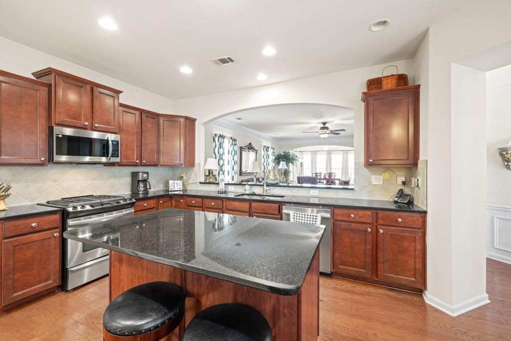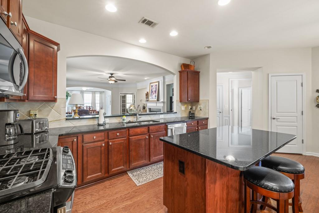 - KitchenBreakfast Bar, Cabinets Stain, Kitchen Island, Pantry, Stone Counters, View to Family Room