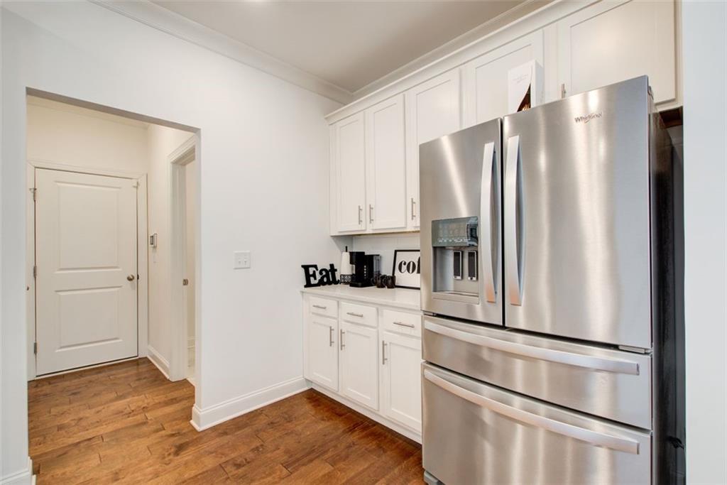 - KitchenStone Counters, Pantry Walk-In, Cabinets White, Solid Surface Counters, Kitchen Island, Pantry, View to Family Room