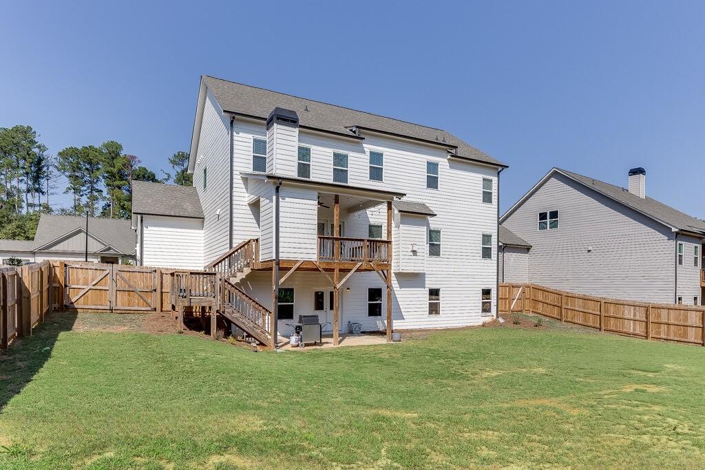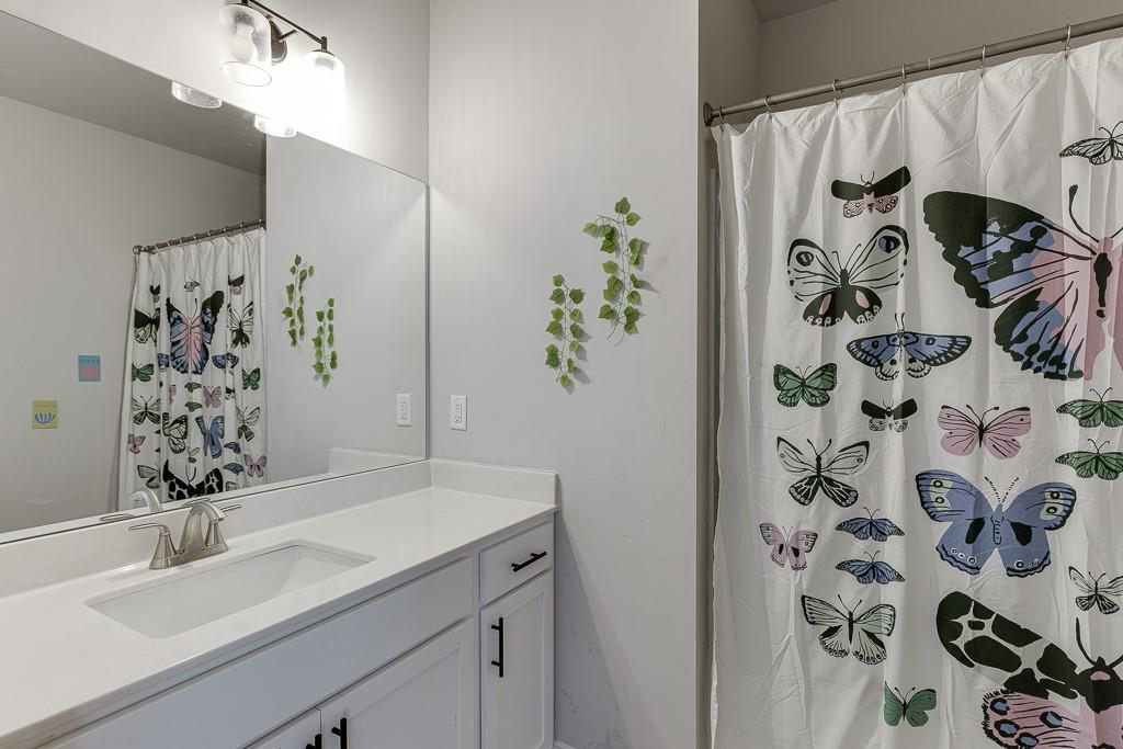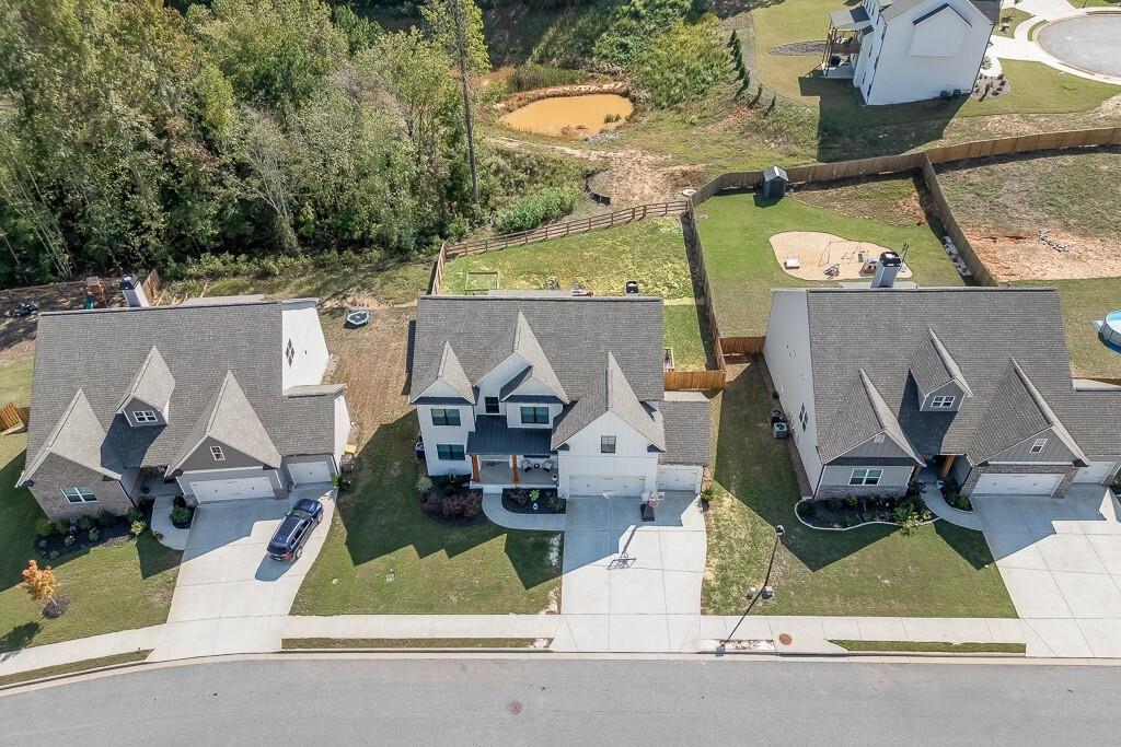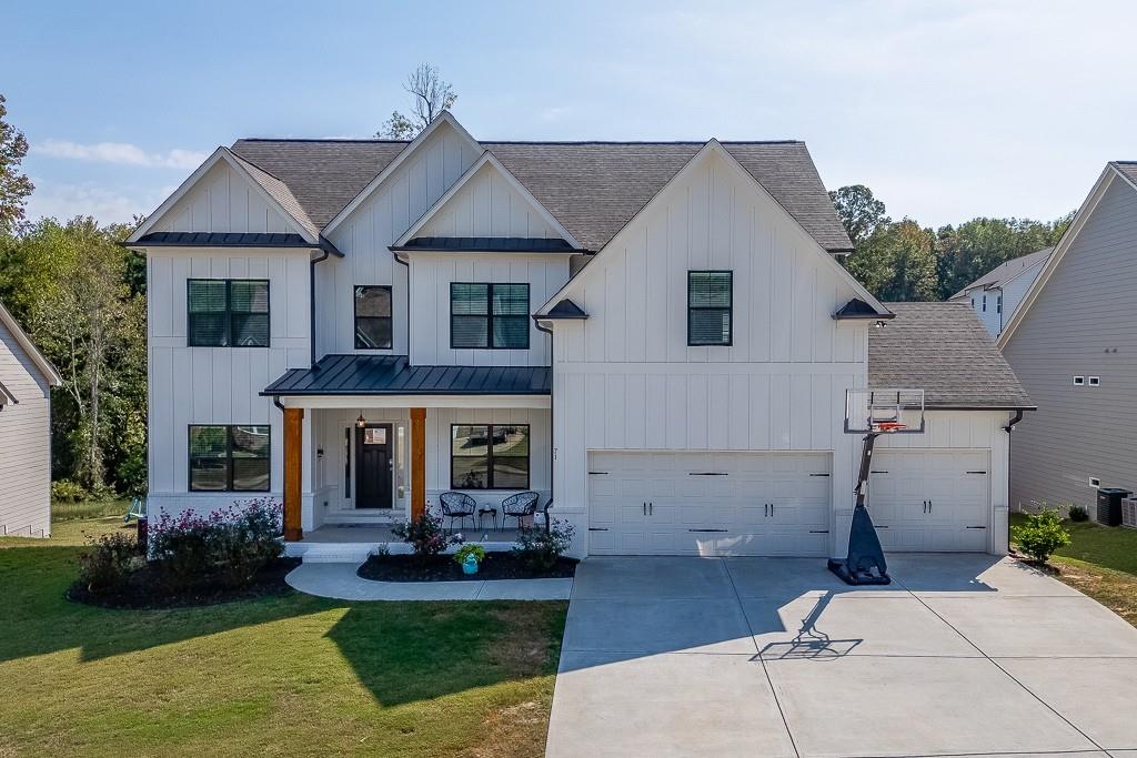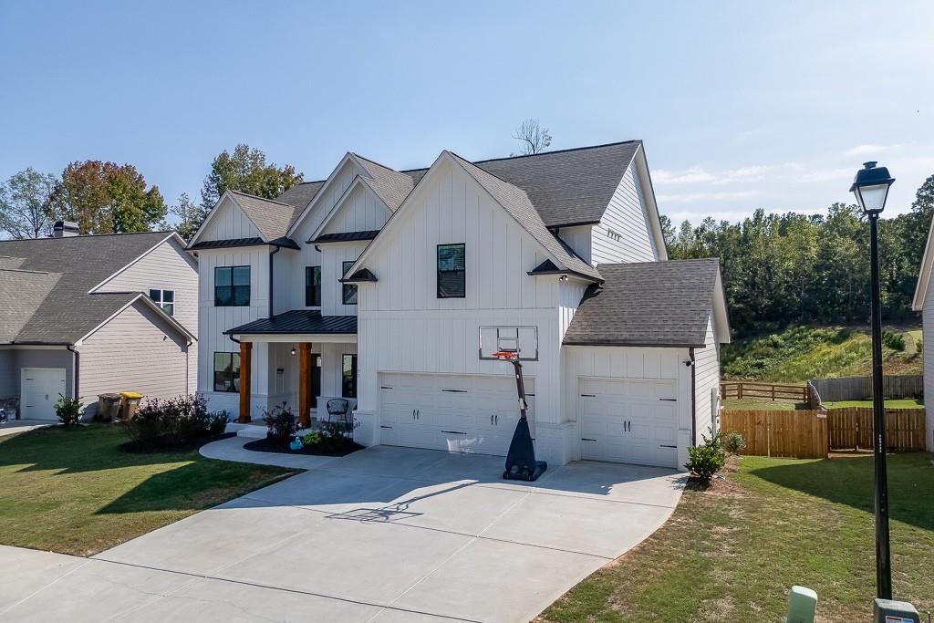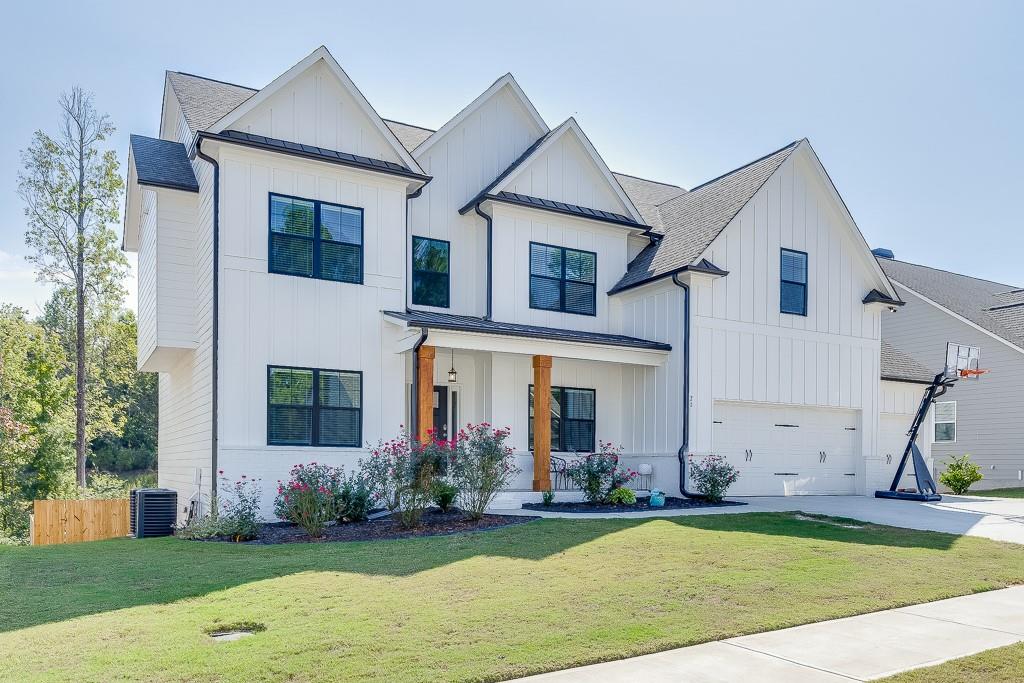 Discover this stunning 5-bedroom, 4-full-bath Craftsman-style home, nestled on a full basement and featuring a 3rd car garage. The property boasts a fenced backyard, perfect for outdoor enjoyment, and a covered front and back porch complete with an inviting outdoor fireplace and fenced-in yard. Step inside to a welcoming main level highlighted by a grand two-story foyer. The home is adorned with hard surface floors throughout, creating a seamless flow. You'll find a versatile office space/flex room with elegant double French doors, a formal dining room for special occasions, and a cozy family room featuring a charming brick fireplace. The main level also includes a convenient guest on-suite, providing full bath access for your visitors. The chef's kitchen is designed for both functionality and entertainment, featuring a recessed oven, farmhouse-style sink, granite countertops, a stylish tile backsplash, under-cabinet lighting, glass cabinet accents, and a grand center island with a breakfast bar, and finally a large pantry for expansive storage. Adjacent to the kitchen, the breakfast room provides a delightful space for casual dining. Retreat to the expansive owner’s suite, which boasts a generous walk-in closet and a luxurious bathroom, complete with a double vanity, an enlarged glass shower with a bench, a relaxing garden tub, and a private toilet room. The teen suite is equally impressive, offering a large closet and a private bathroom, while the secondary bedrooms are spacious and thoughtfully designed, sharing a Jack-and-Jill style bathroom with convenient access to the hall. The upper level offers a large media room/flex space for additional entertaining. All of this on a full basement with an open terrace level for a more finished feel when entering the basement.
