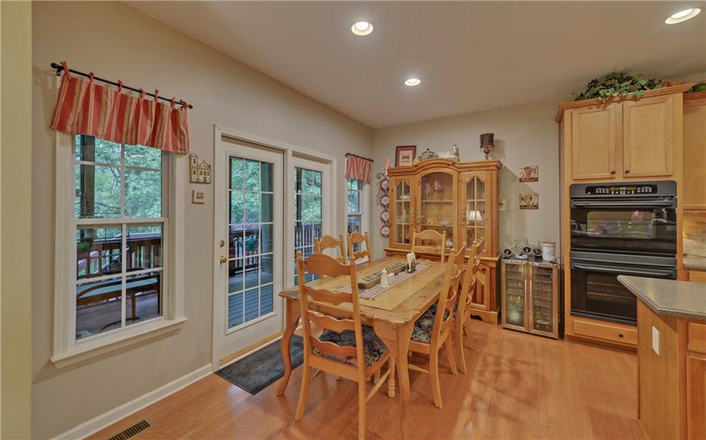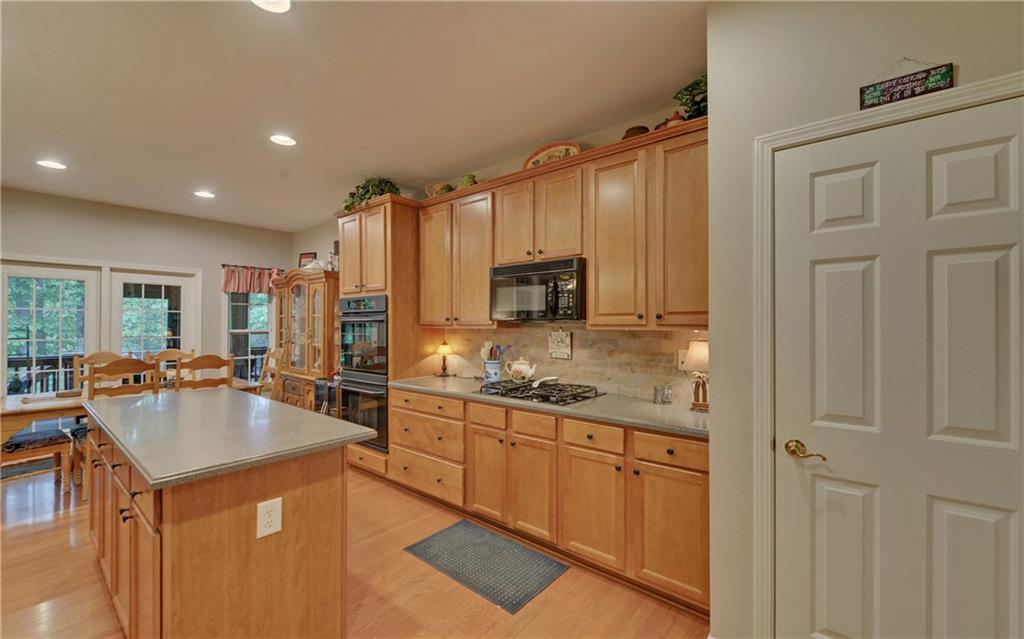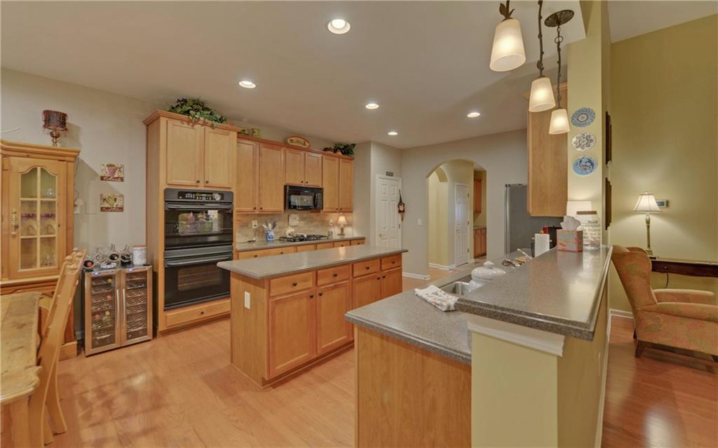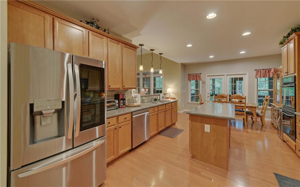 - KitchenBreakfast Bar, Breakfast Room, Cabinets Stain, Pantry, Solid Surface Counters, View to Family Room