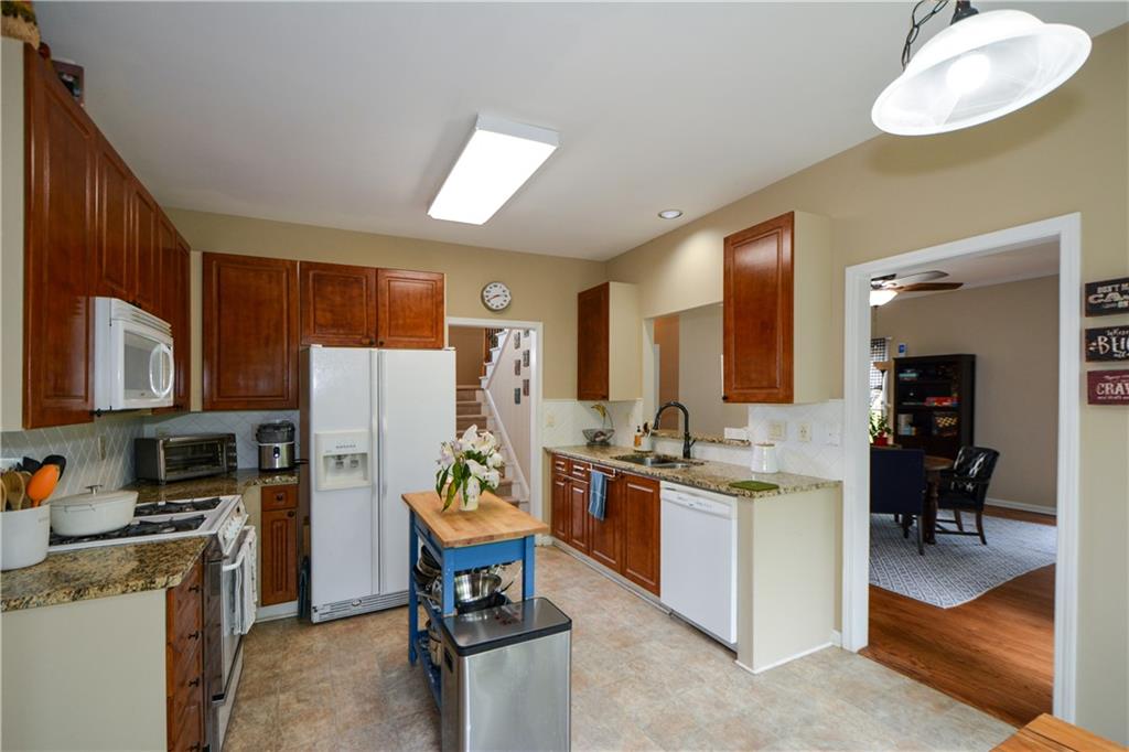 - KitchenBreakfast Bar, Cabinets Stain, Eat-in Kitchen, Pantry, Stone Counters, View to Family Room