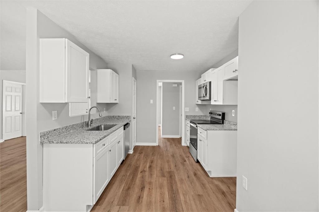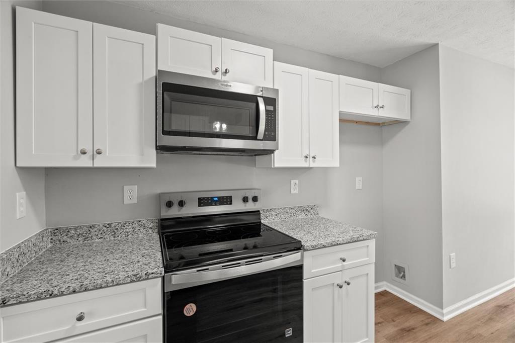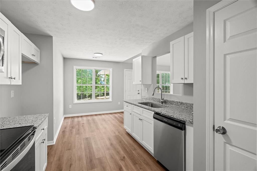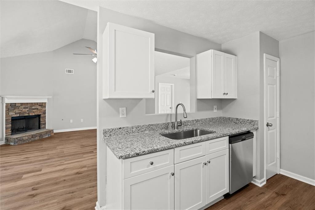 - KitchenCabinets White, Eat-in Kitchen, Stone Counters, View to Family Room