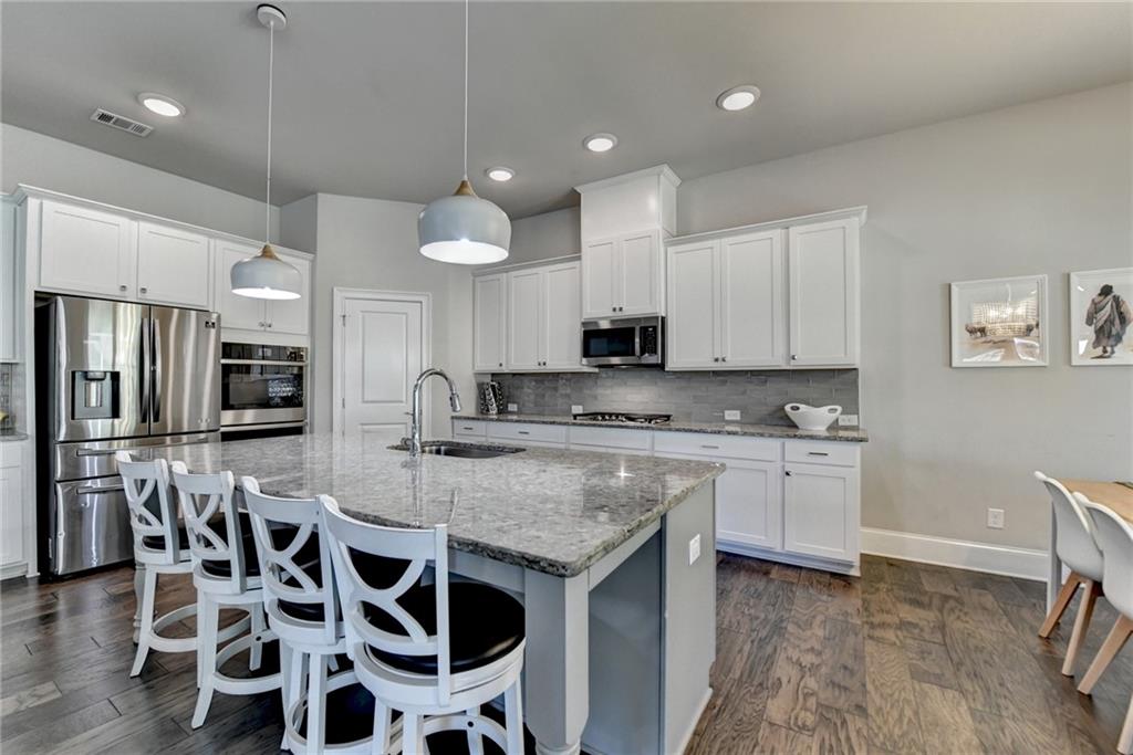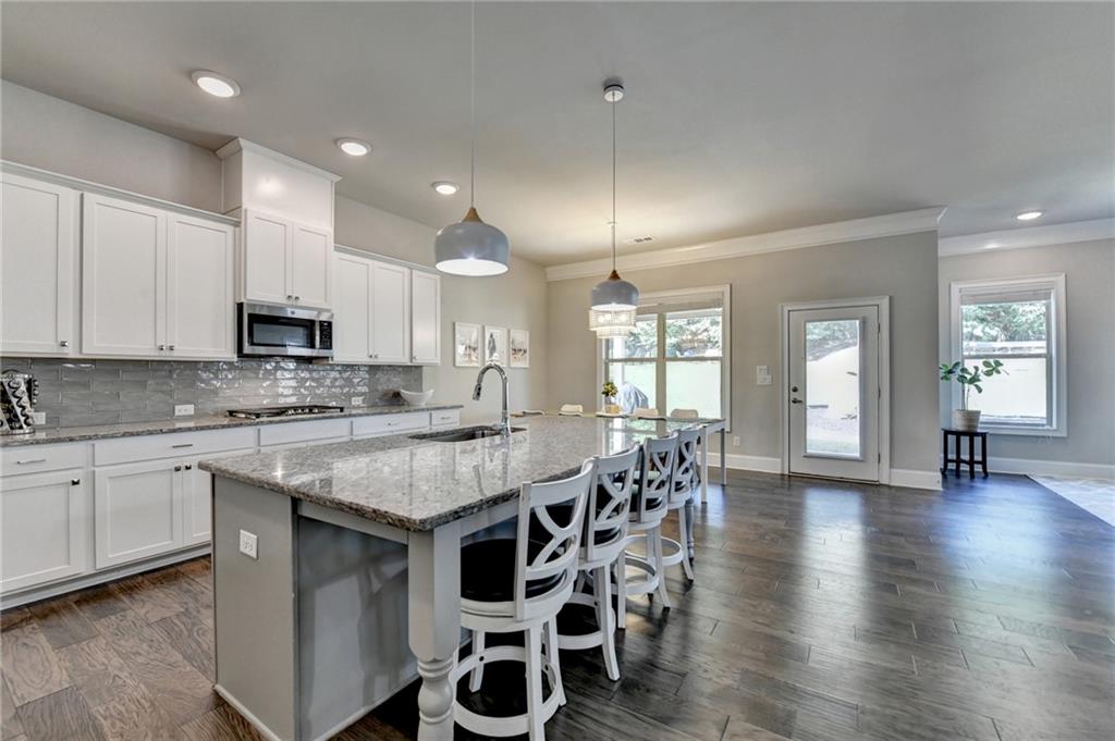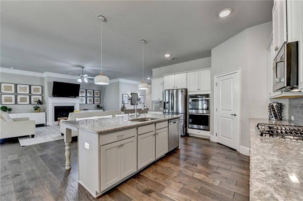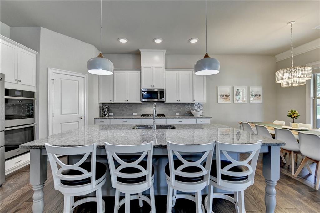 - KitchenBreakfast Room, Cabinets White, Kitchen Island, Pantry Walk-In, Stone Counters, View to Family Room