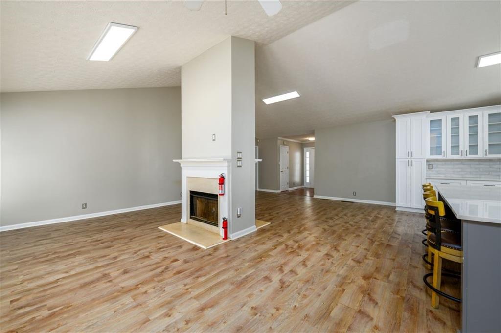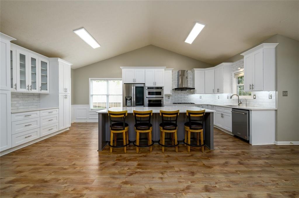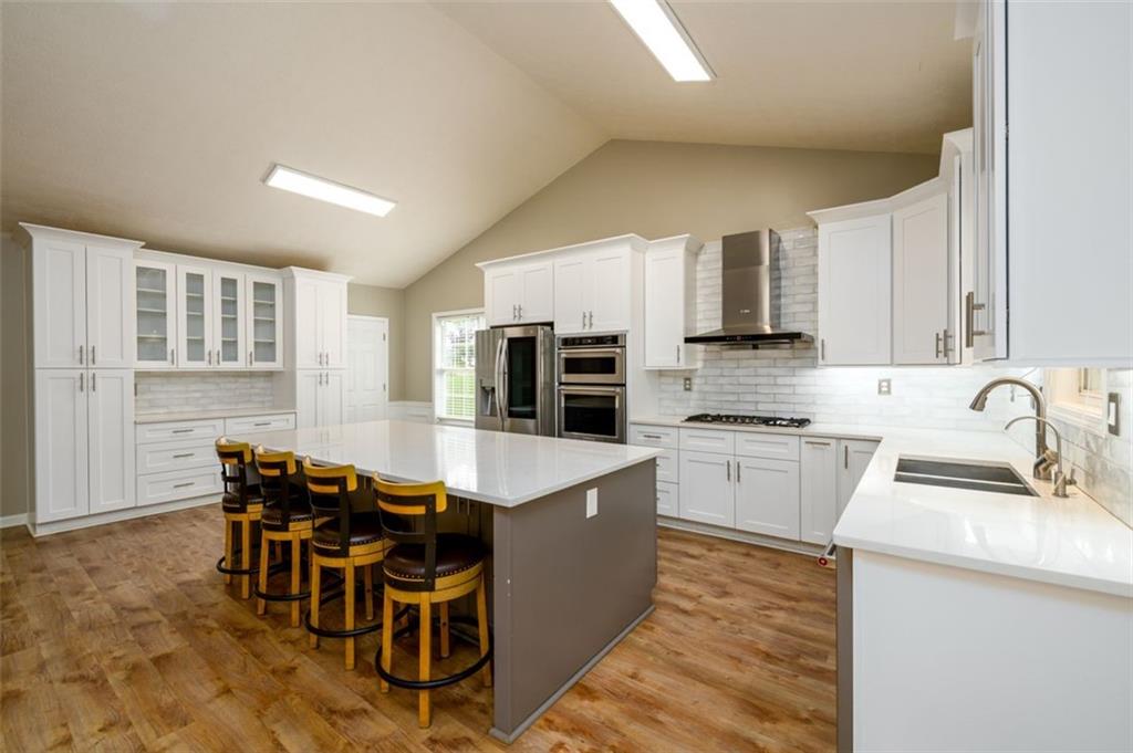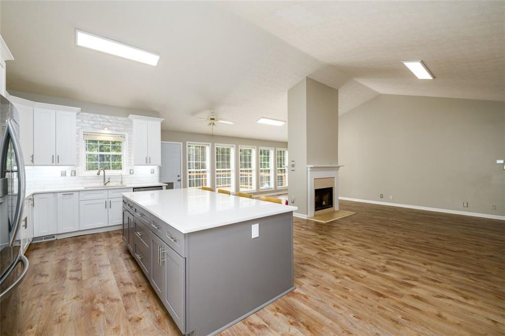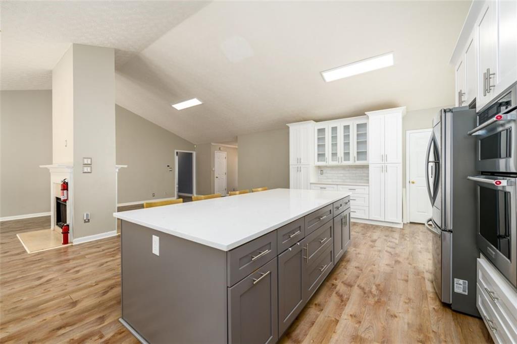 - KitchenBreakfast Bar, Cabinets White, Eat-in Kitchen, Kitchen Island, Pantry, Solid Surface Counters, Stone Counters, View to Family Room