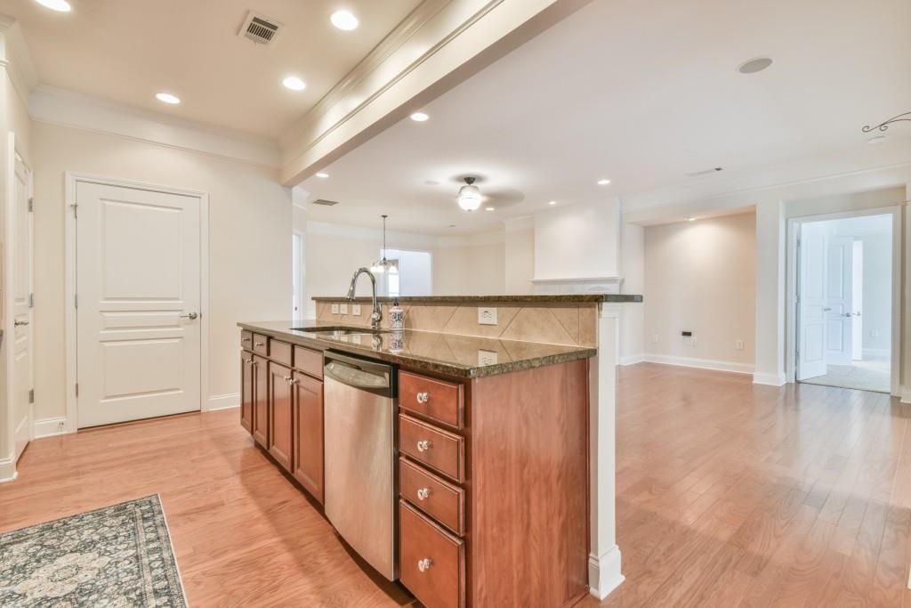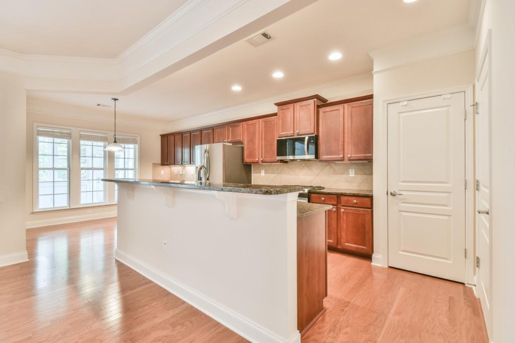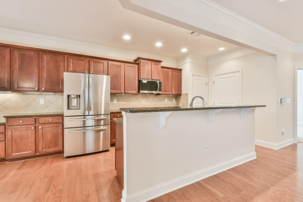 - KitchenBreakfast Bar, Cabinets Stain, Eat-in Kitchen, Kitchen Island, Pantry, Stone Counters, View to Family Room