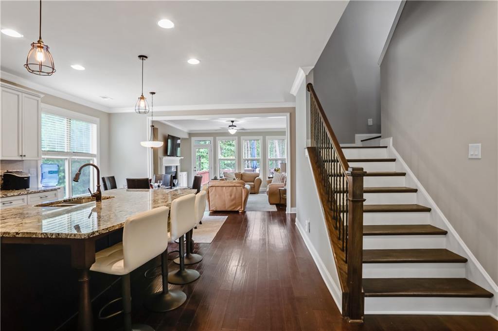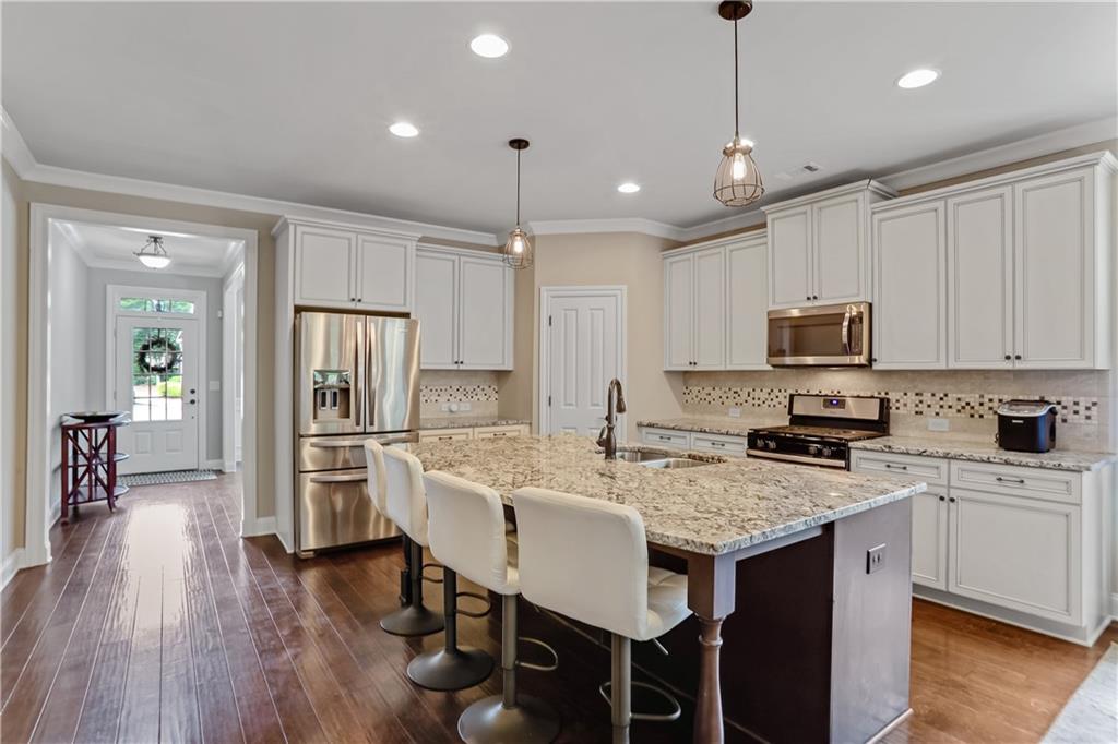 - KitchenBreakfast Bar, Cabinets White, Eat-in Kitchen, Kitchen Island, Pantry Walk-In, Stone Counters, View to Family Room