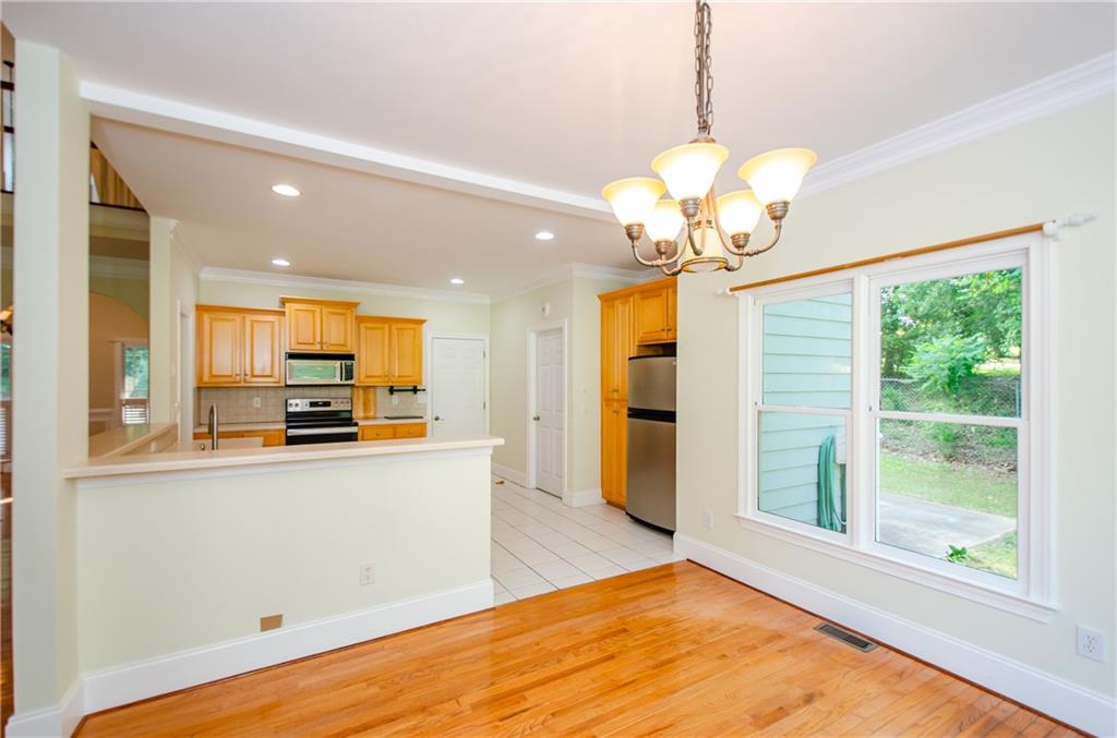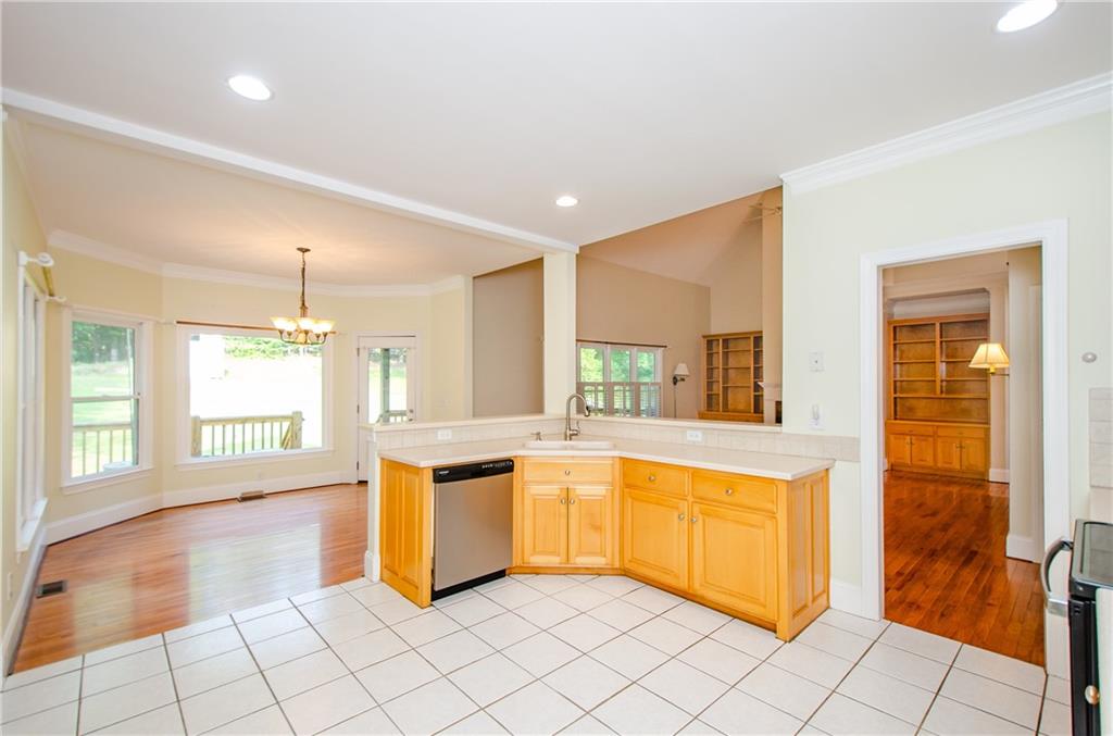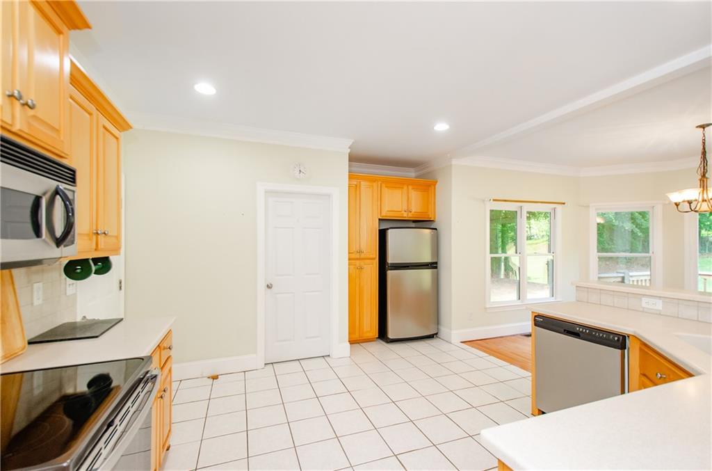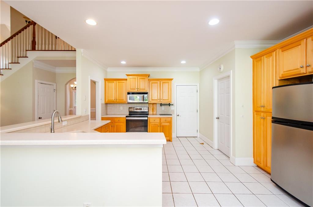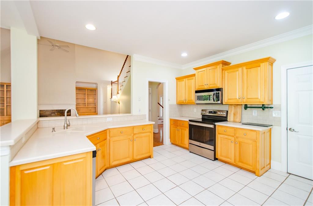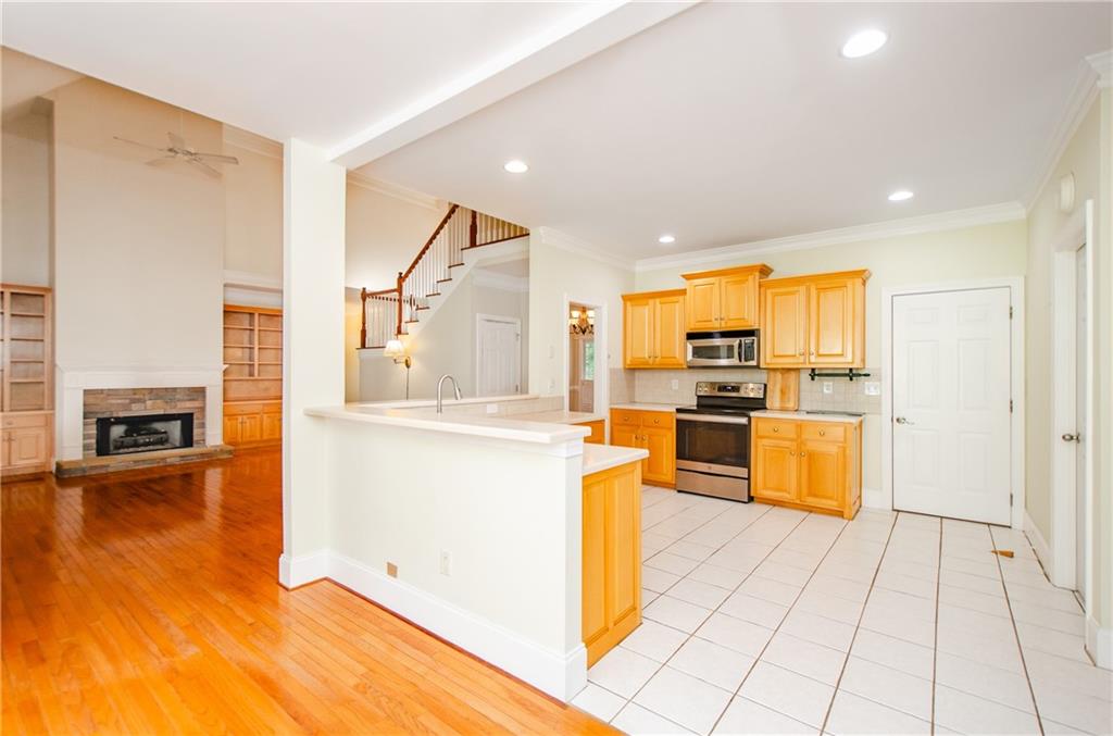 - KitchenCabinets Stain, Eat-in Kitchen, Pantry, Solid Surface Counters, View to Family Room