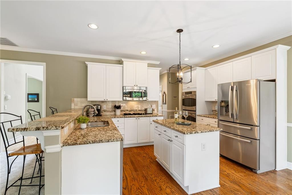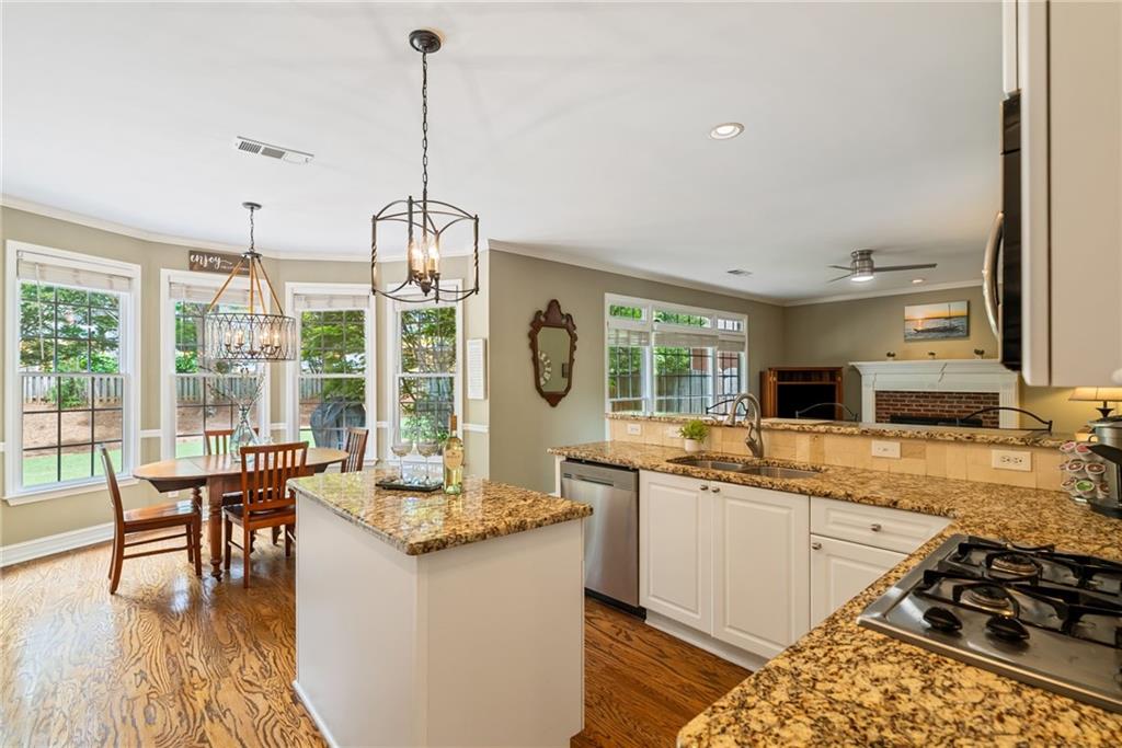 - KitchenBreakfast Bar, Cabinets White, Eat-in Kitchen, Kitchen Island, Pantry, Stone Counters, View to Family Room