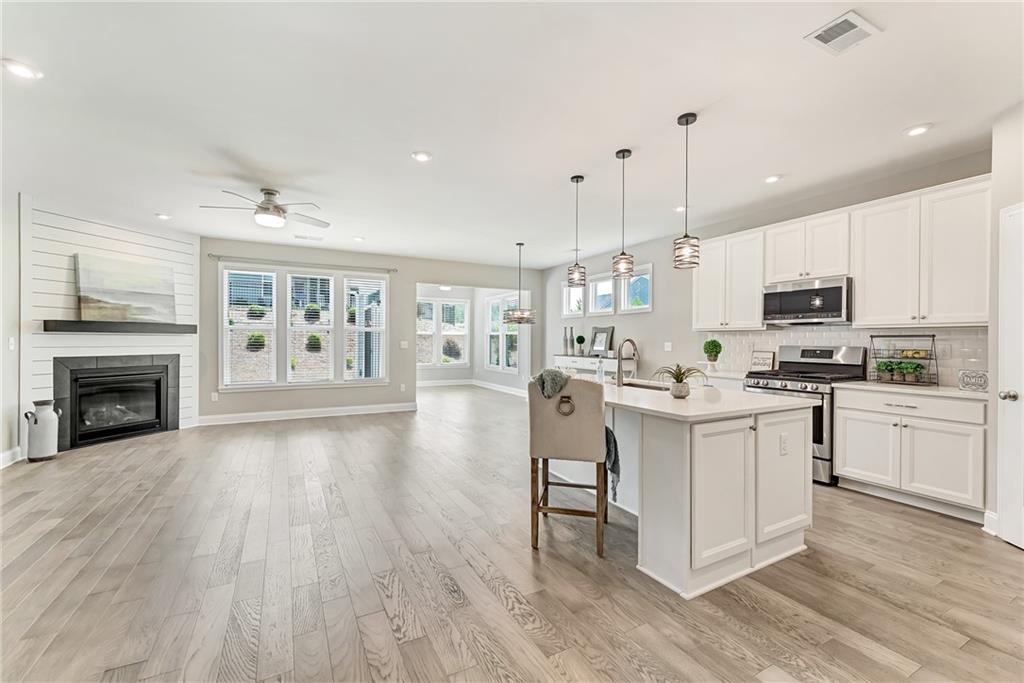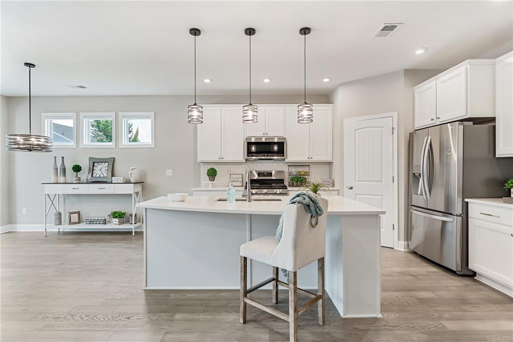 - KitchenBreakfast Bar, Cabinets White, Eat-in Kitchen, Kitchen Island, Other Surface Counters, Pantry, Solid Surface Counters, View to Family Room