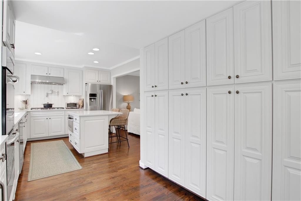 - KitchenCabinets White, Eat-in Kitchen, Kitchen Island, Pantry, Stone Counters, View to Family Room