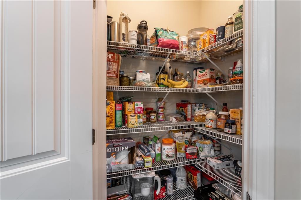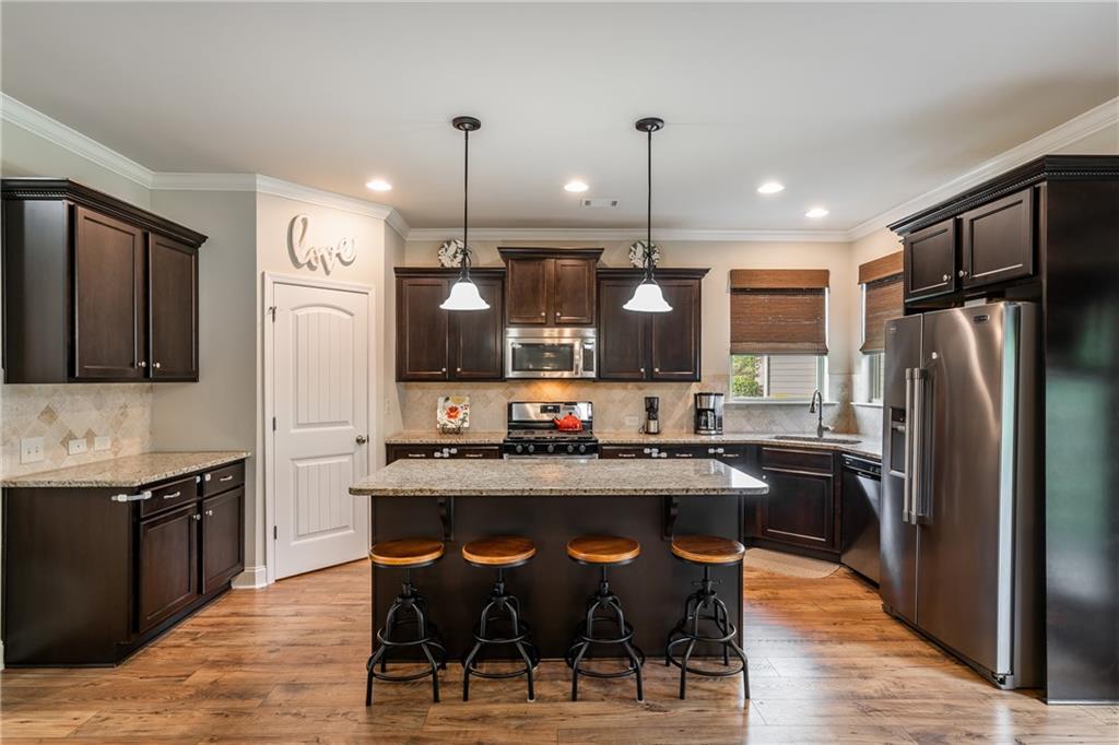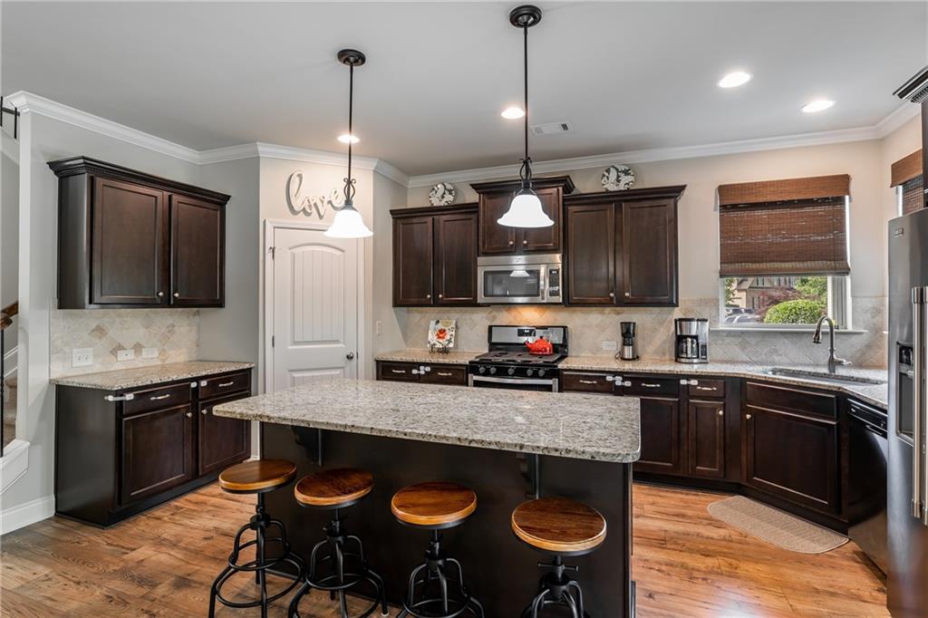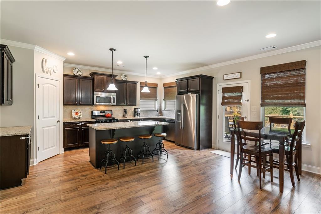 - KitchenCabinets Stain, Eat-in Kitchen, Kitchen Island, Pantry, Stone Counters, View to Family Room
