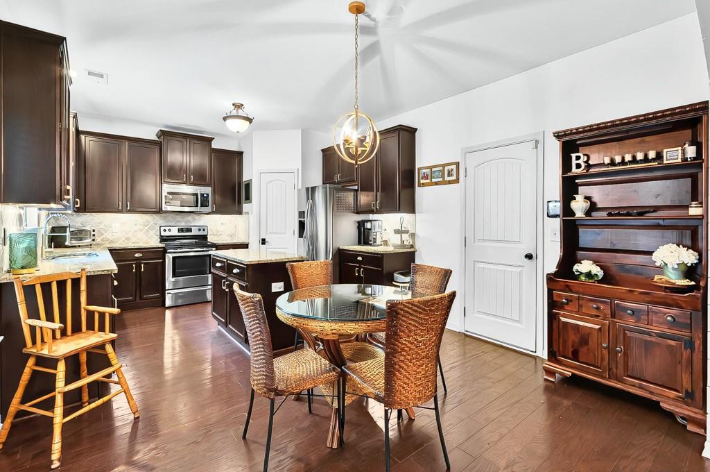 - KitchenBreakfast Room, Cabinets Stain, Eat-in Kitchen, Kitchen Island, Stone Counters, View to Family Room