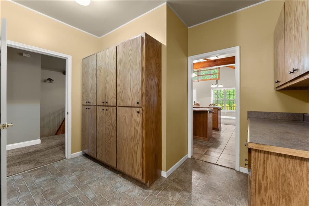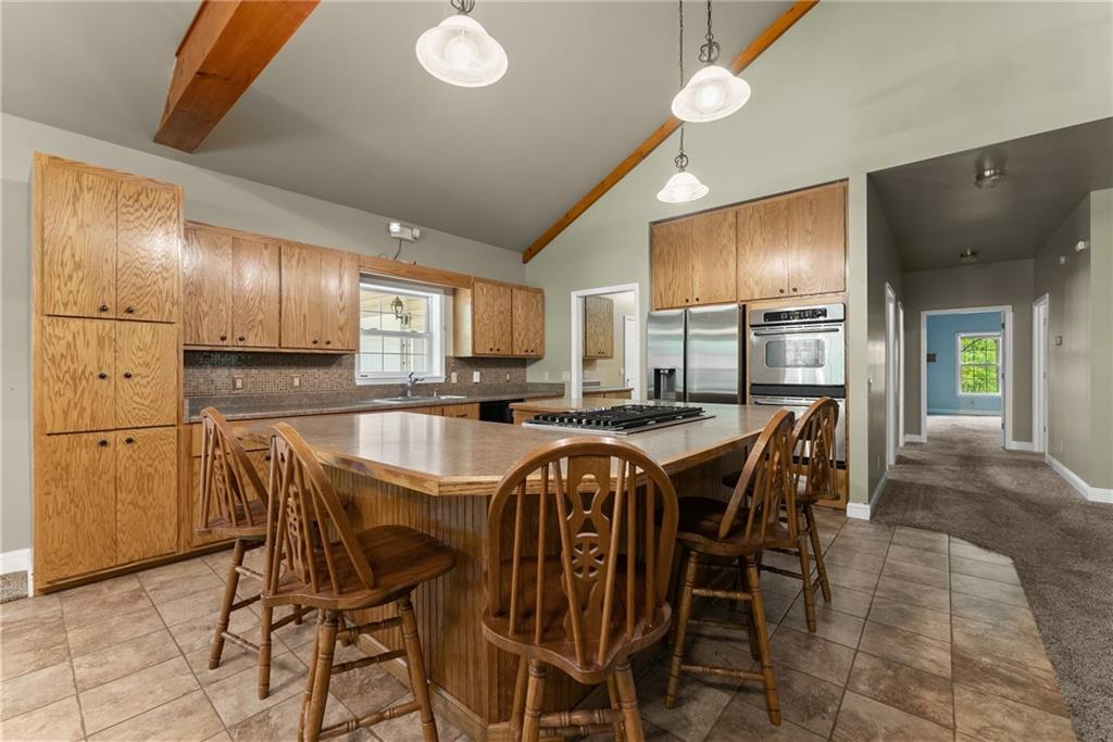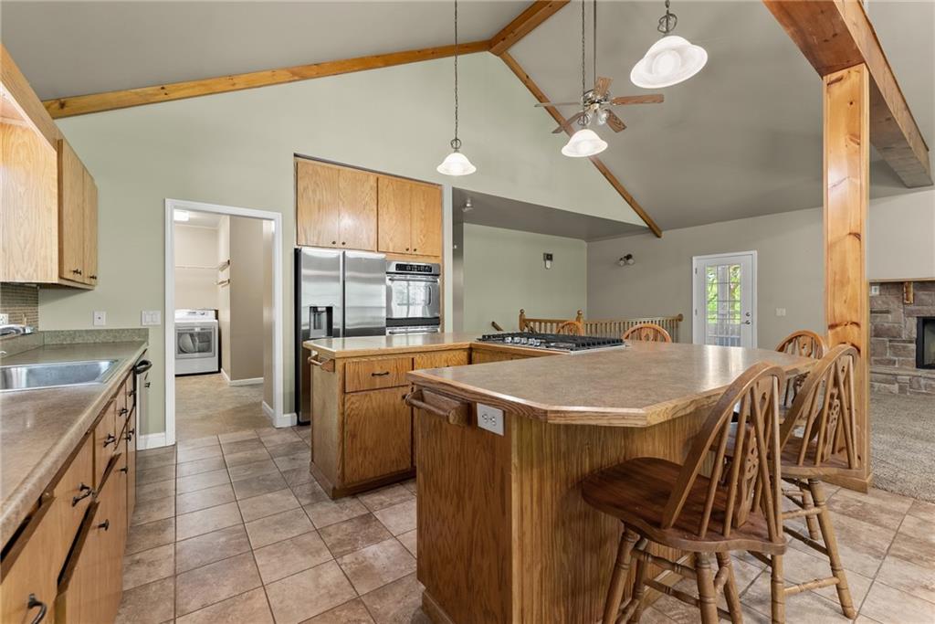 - KitchenBreakfast Bar, Cabinets Stain, Kitchen Island, Laminate Counters, Pantry Walk-In, Second Kitchen, View to Family Room