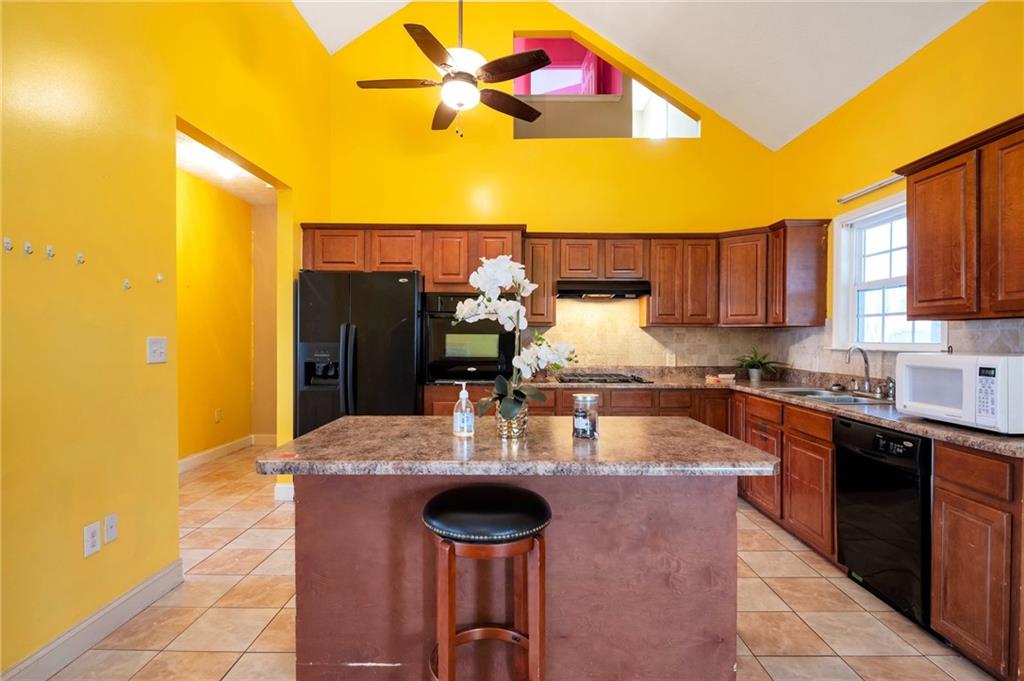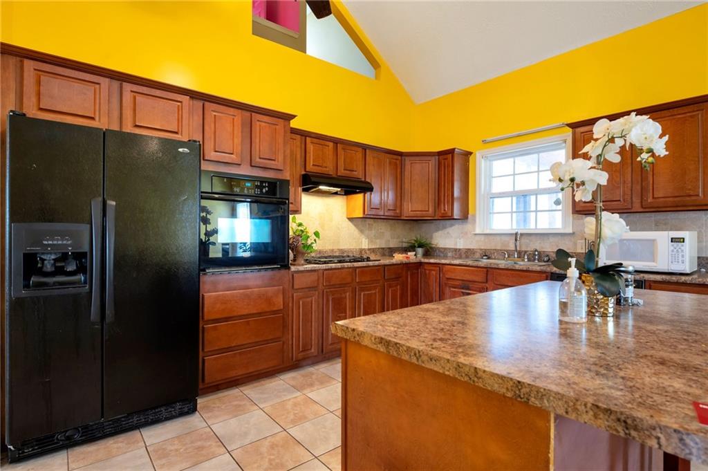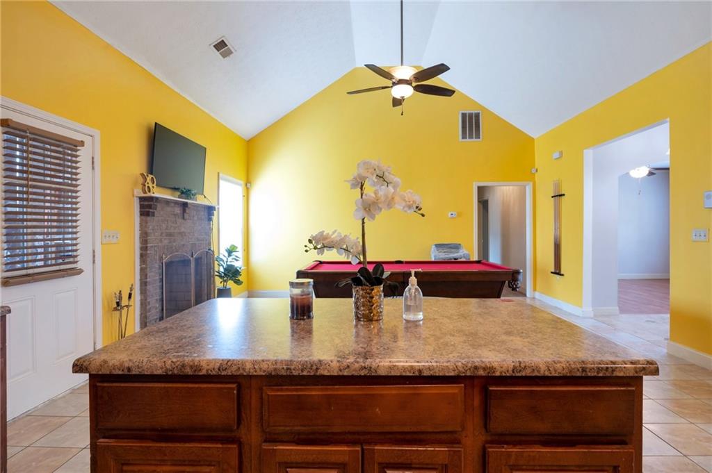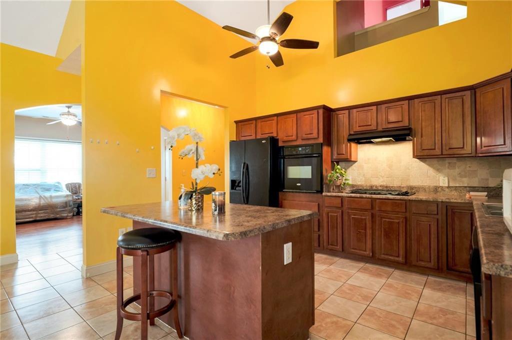 - KitchenBreakfast Bar, Cabinets Stain, Kitchen Island, View to Family Room
