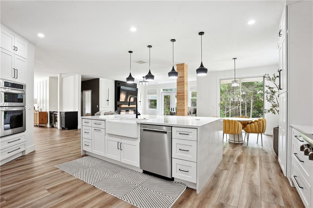 - KitchenBreakfast Bar, Cabinets White, Kitchen Island, Stone Counters, View to Family Room