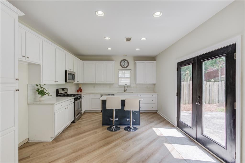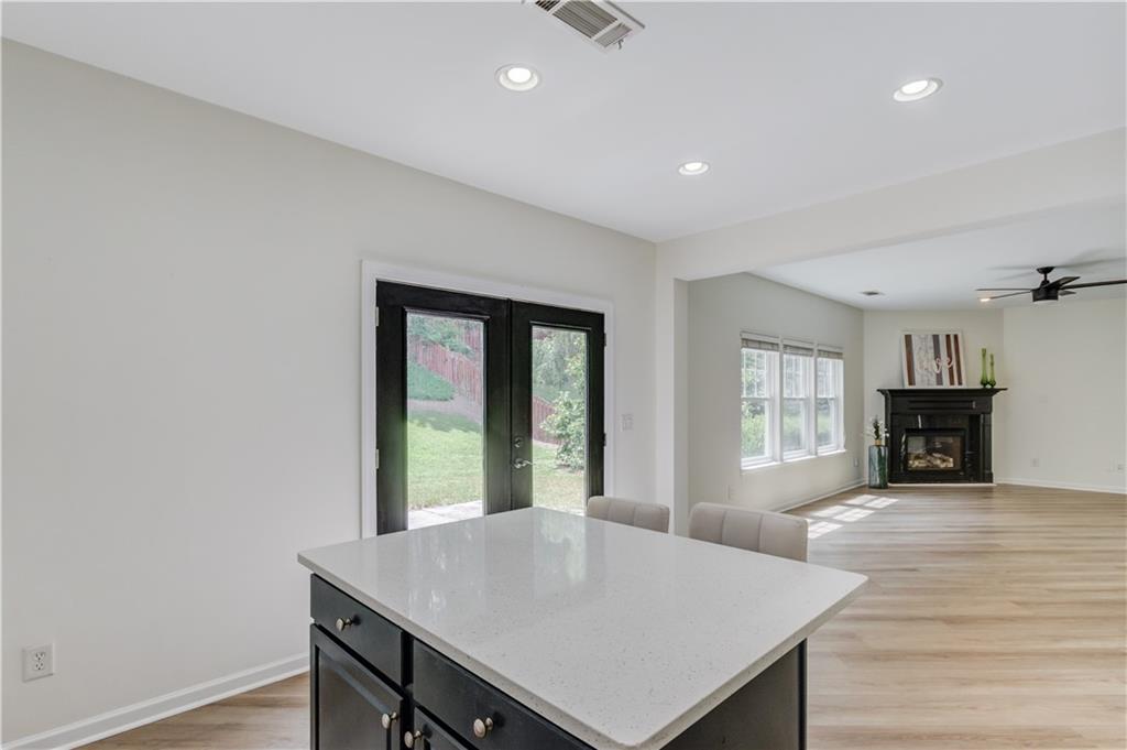 - KitchenBreakfast Bar, Cabinets White, Eat-in Kitchen, Kitchen Island, Stone Counters