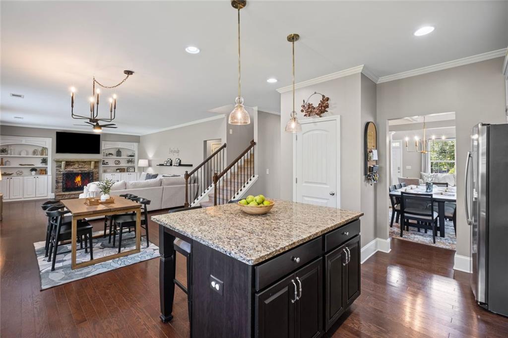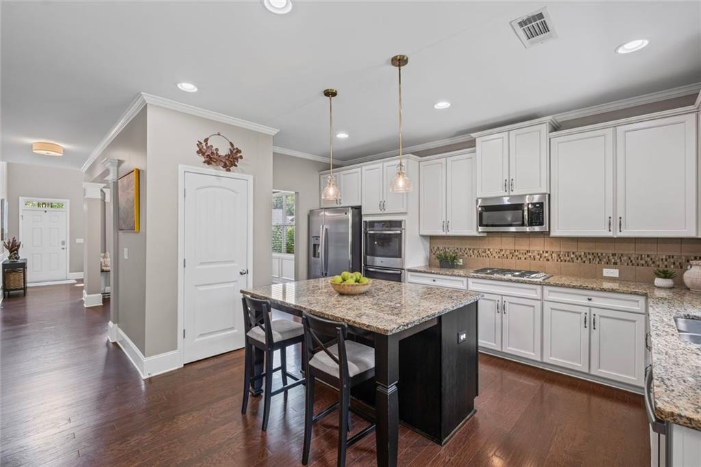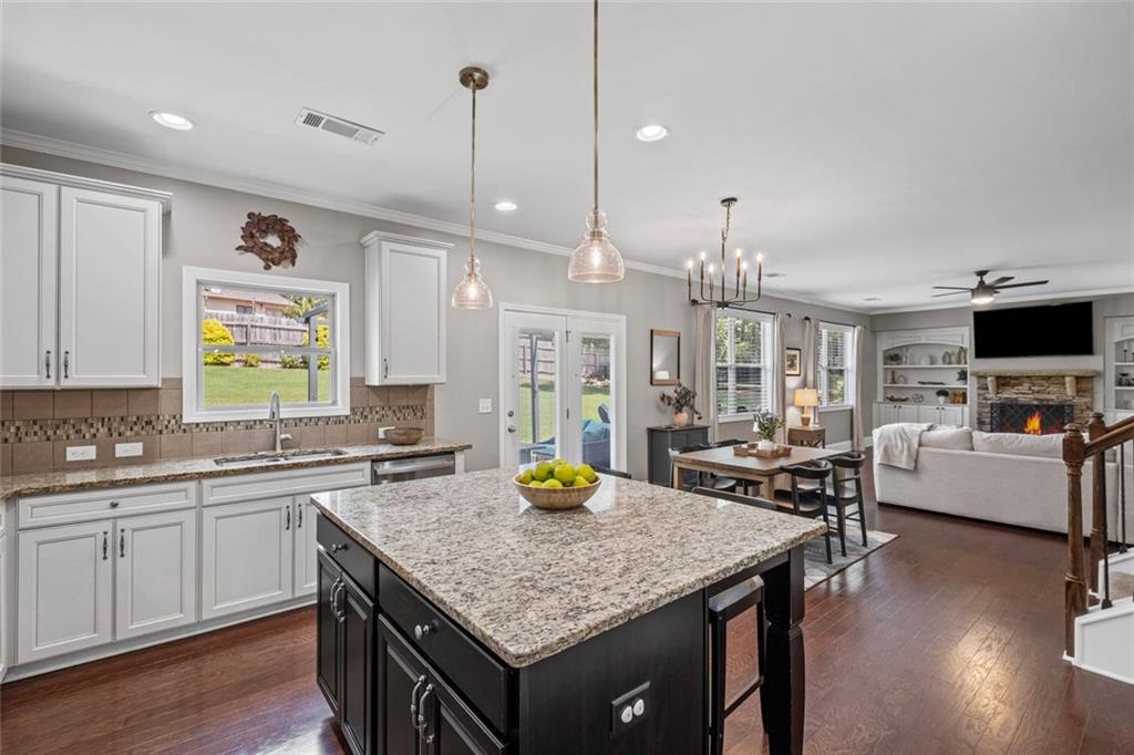 - KitchenBreakfast Bar, Cabinets White, Kitchen Island, Pantry, Stone Counters, View to Family Room
