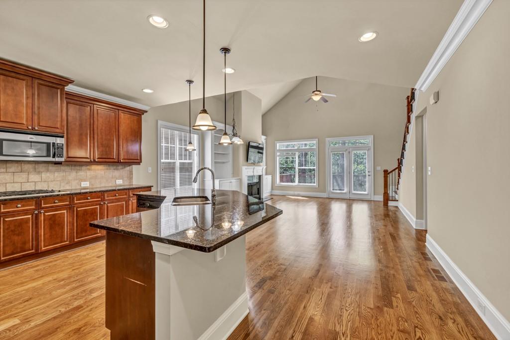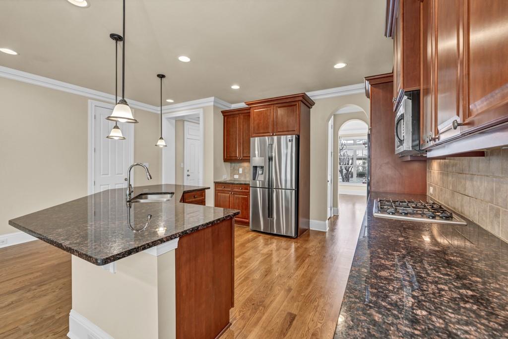 - KitchenBreakfast Bar, Cabinets Stain, Kitchen Island, Pantry Walk-In, Solid Surface Counters, View to Family Room