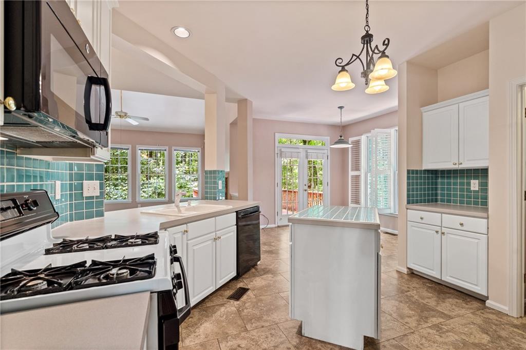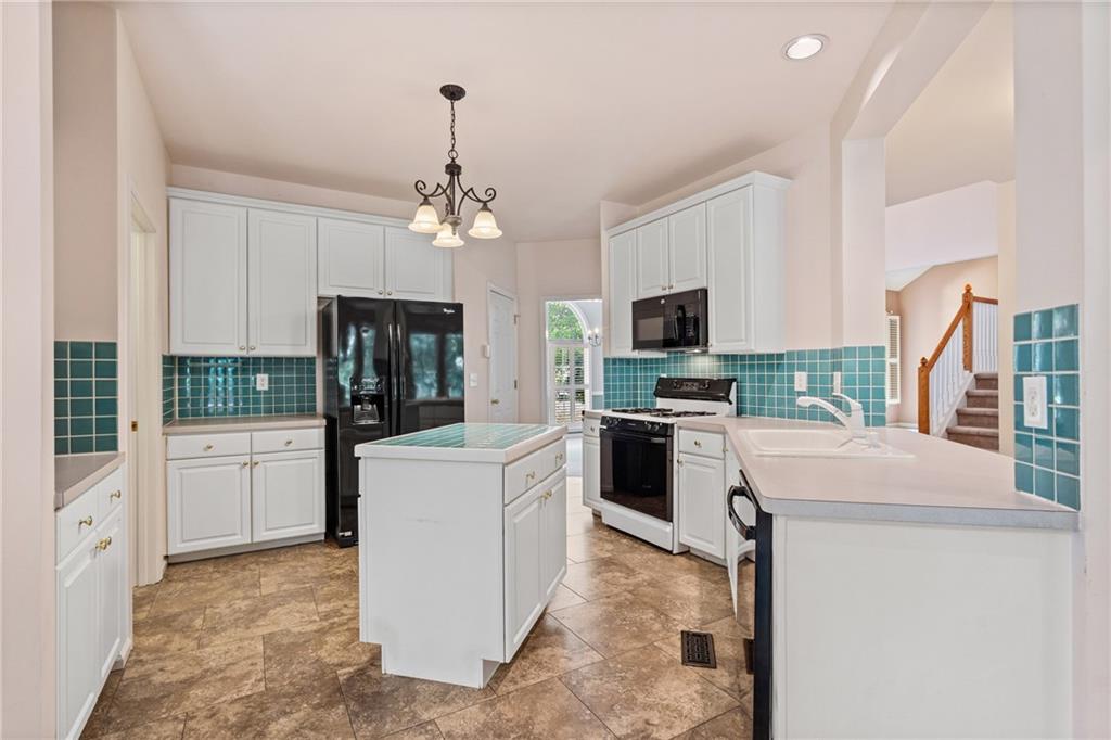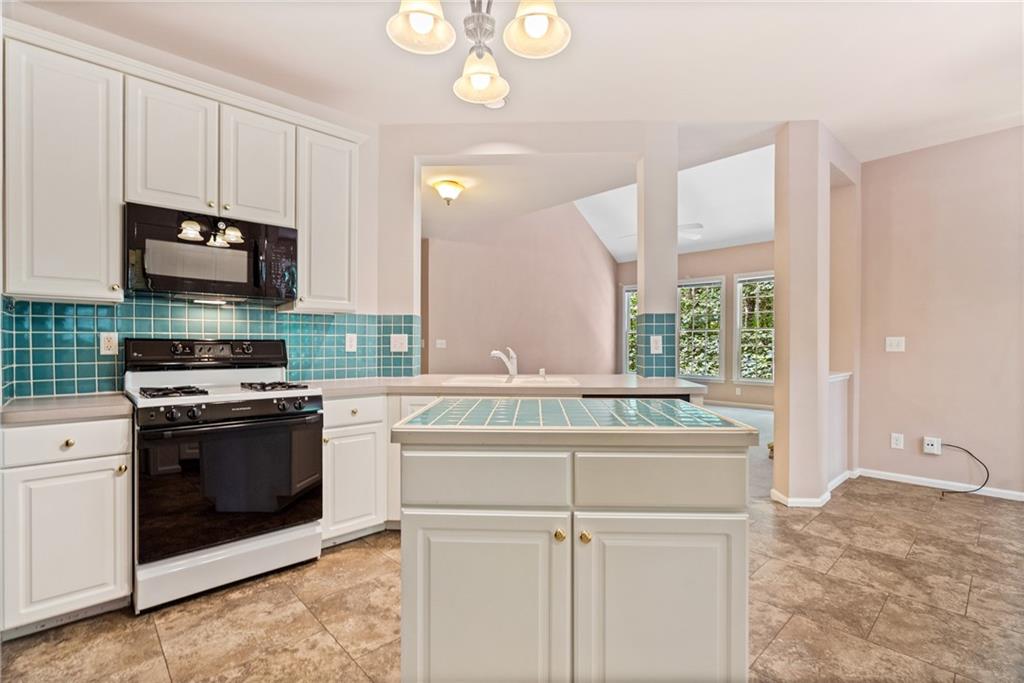 - KitchenBreakfast Bar, Breakfast Room, Cabinets White, Eat-in Kitchen, Kitchen Island, Laminate Counters, Pantry, View to Family Room