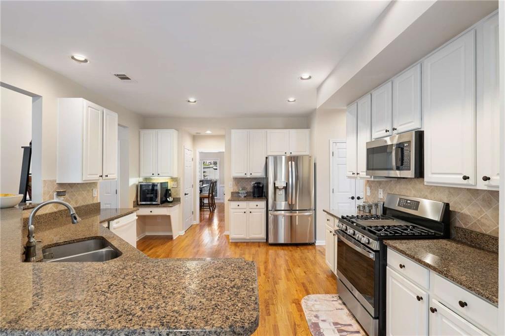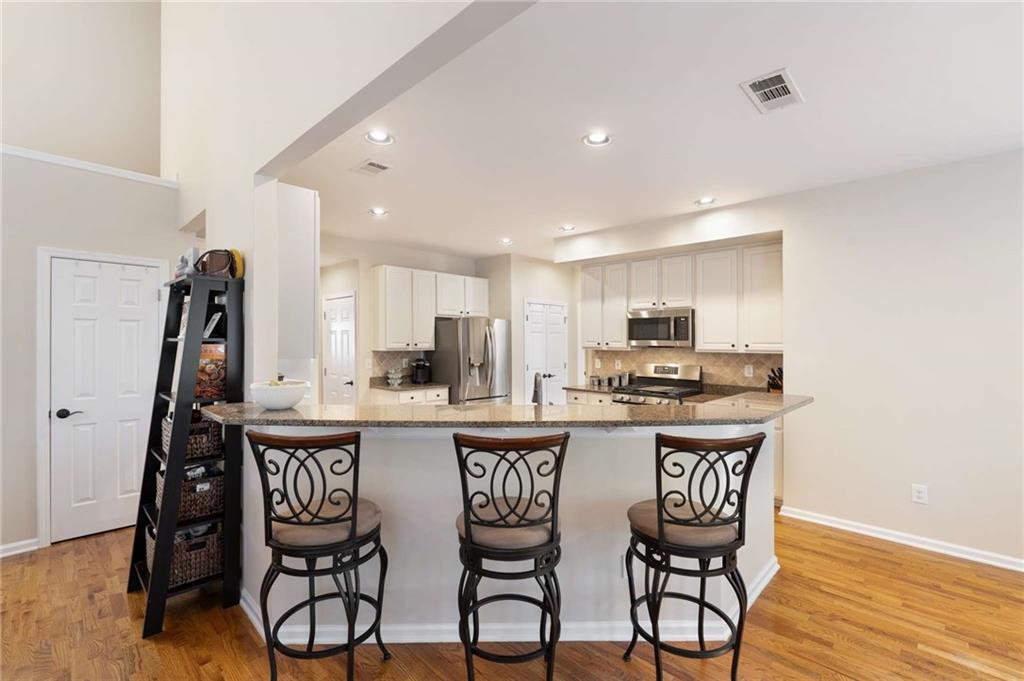 - KitchenBreakfast Bar, Breakfast Room, Cabinets White, Pantry, Solid Surface Counters, View to Family Room