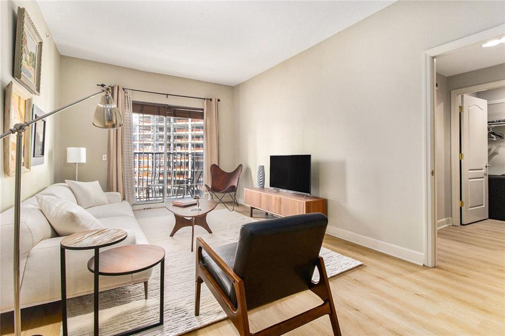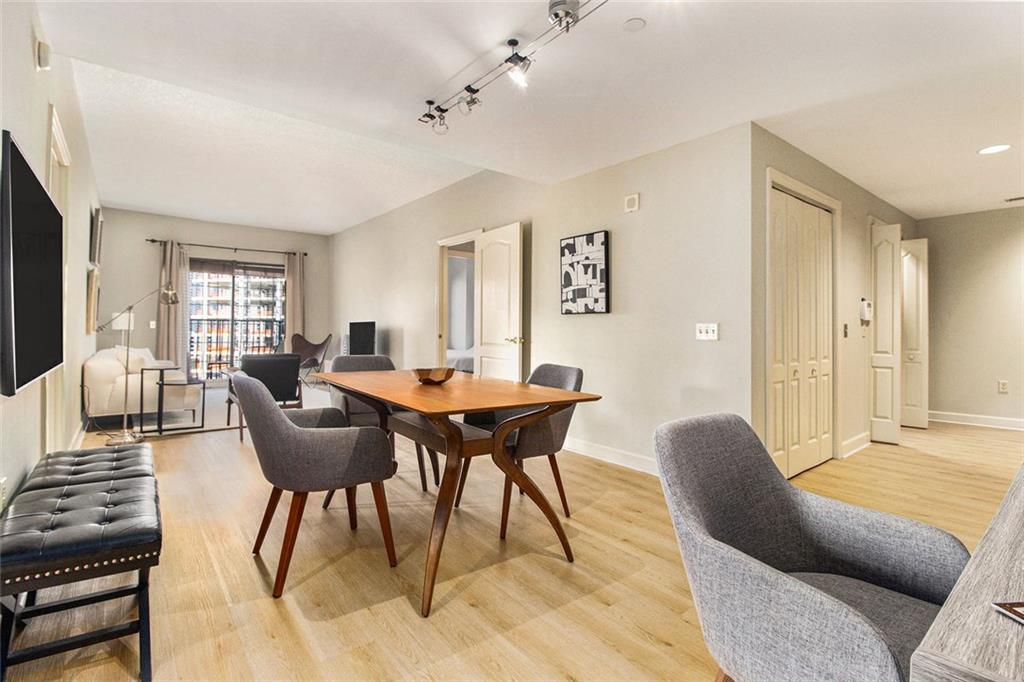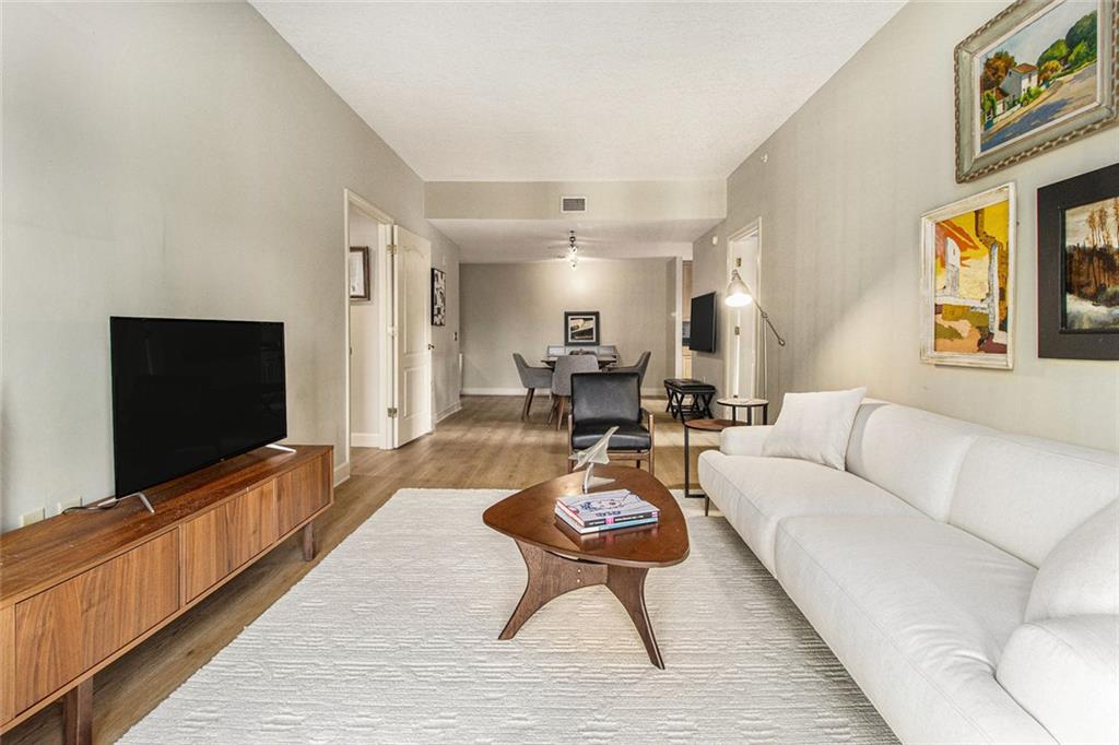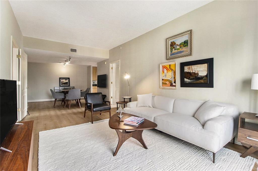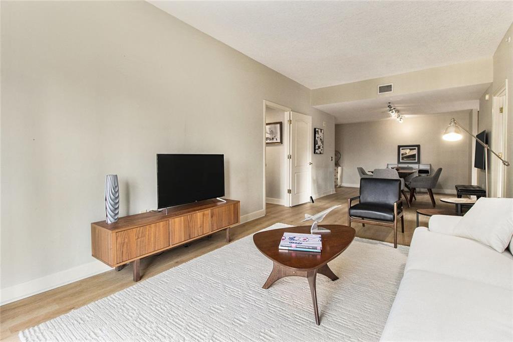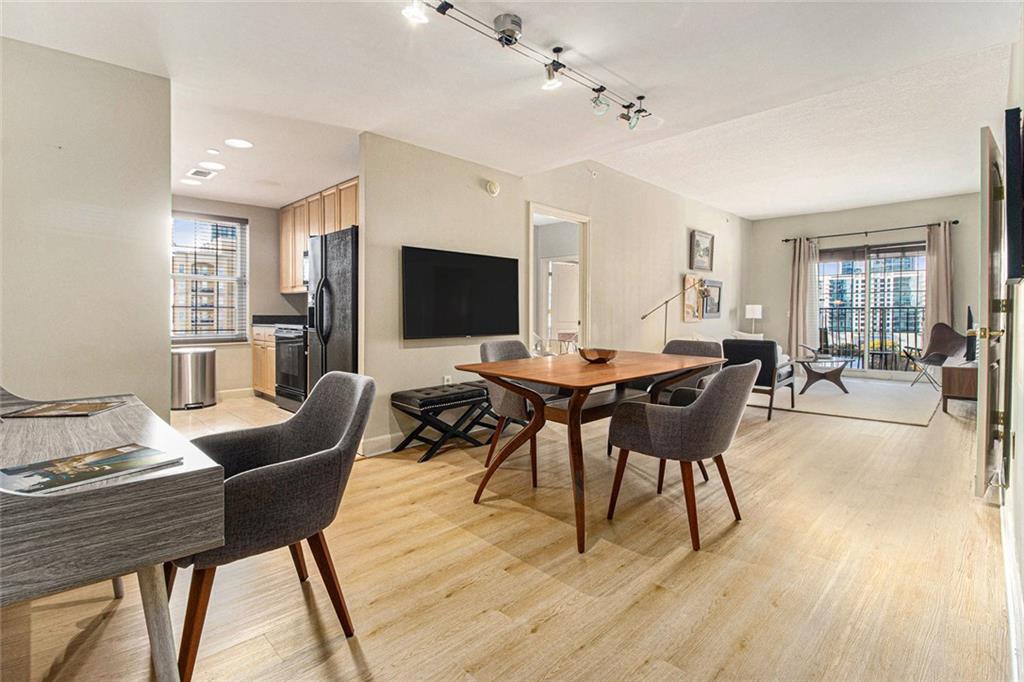 Welcome to the Mayfair Renaissance in the heart of Midtown Atlanta. This 2-bedroom, 2-bathroom condo offers a move-in ready opportunity for urban living at its best. Located just steps from Piedmont Park, top dining, and Midtown's vibrant attractions, this property combines convenience with comfort and luxury. The spacious living room features large windows that provide abundant natural light and views of the Midtown skyline, and the building's Western garden. The open dining area flows seamlessly from the living space, making it ideal for entertaining. The primary bedroom includes double closets, a private ensuite bathroom, and a private balcony with views Piedmont Park, while the second bedroom also offers ample space and a full ensuite bath. The kitchen features granite countertops, a large fridge, microwave, range, and dishwasher. Additional features include a 2 parking spots in a secure garage, new flooring throughout the main living areas and marble tile flooring in the kitchen and baths, along with laundry room with full-size washer and dryer. Residents of the Mayfair Renaissance enjoy amenities such as a gym, saline outdoor pool, theater room, library, club room, grilling area, and a peaceful gazebo. The building provides 24/7 concierge services, including security and package handling. Recent updates to the building include refreshed decor in the lobby and all common areas, and built-in super high-speed Fiber internet that is included in the monthly HOA. Onsite workspaces add convenience for those working from home. Enjoy the best of Midtown living with this well-located and thoughtfully designed condo, offering a perfect blend of urban convenience and a peaceful retreat, just 1/2 block from Piedmont Park and convenient shopping, dining, and arts all within walking distance.