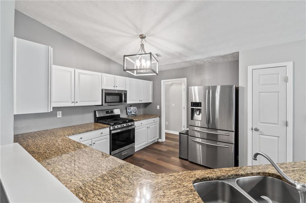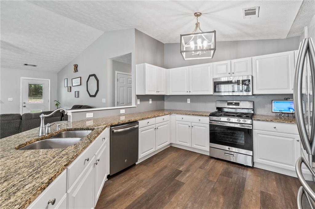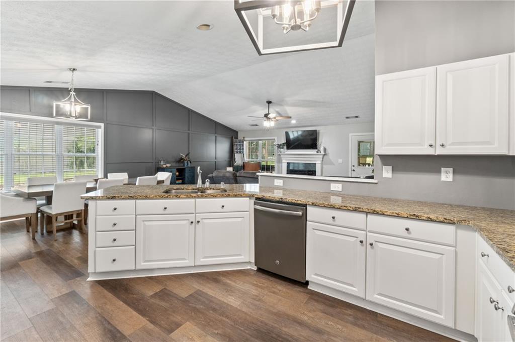 - KitchenCabinets White, Eat-in Kitchen, Pantry, Stone Counters, View to Family Room